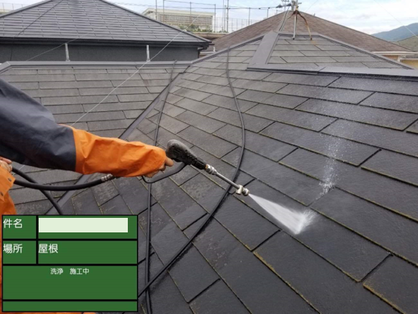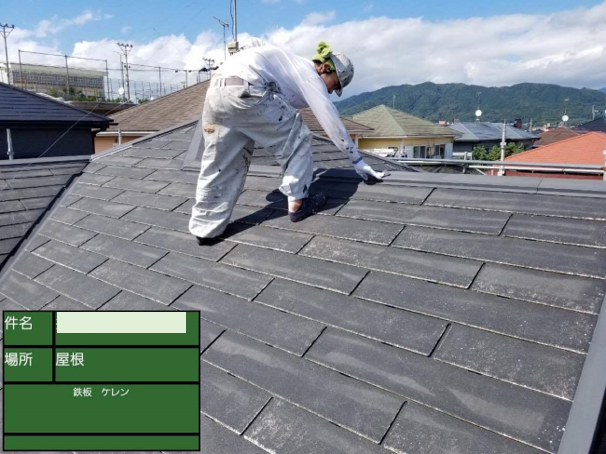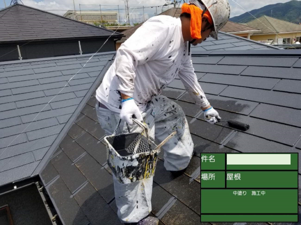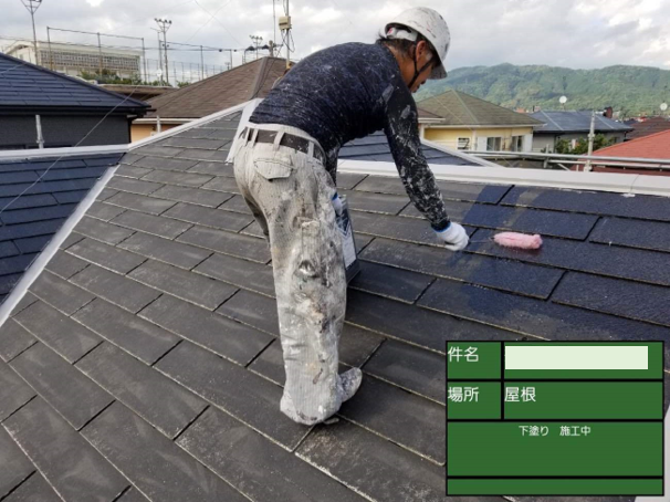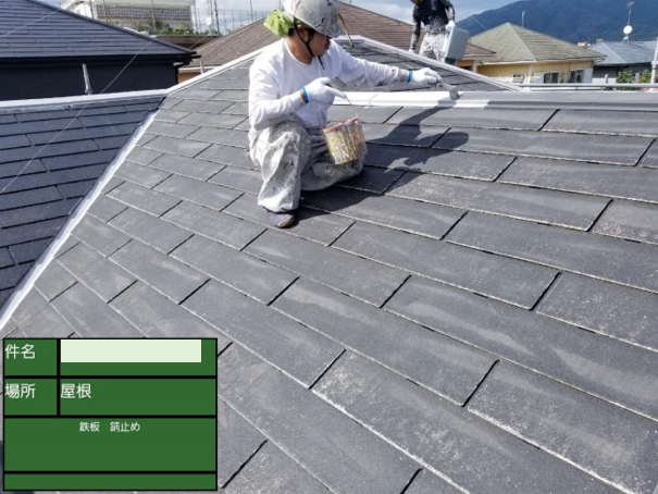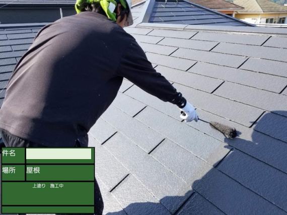 画像中央の少し右手に黒い器具を差し込んでいる最中の様子です。ストレートタイプの瓦には、多くの場合でこのタスペーサーと呼ばれる器具のが必要です。屋根には本来通気用の隙間があるのですが、タスペーサーを取り付けることで塗装によってその隙間をふさいでしまうのを防いてくれます。