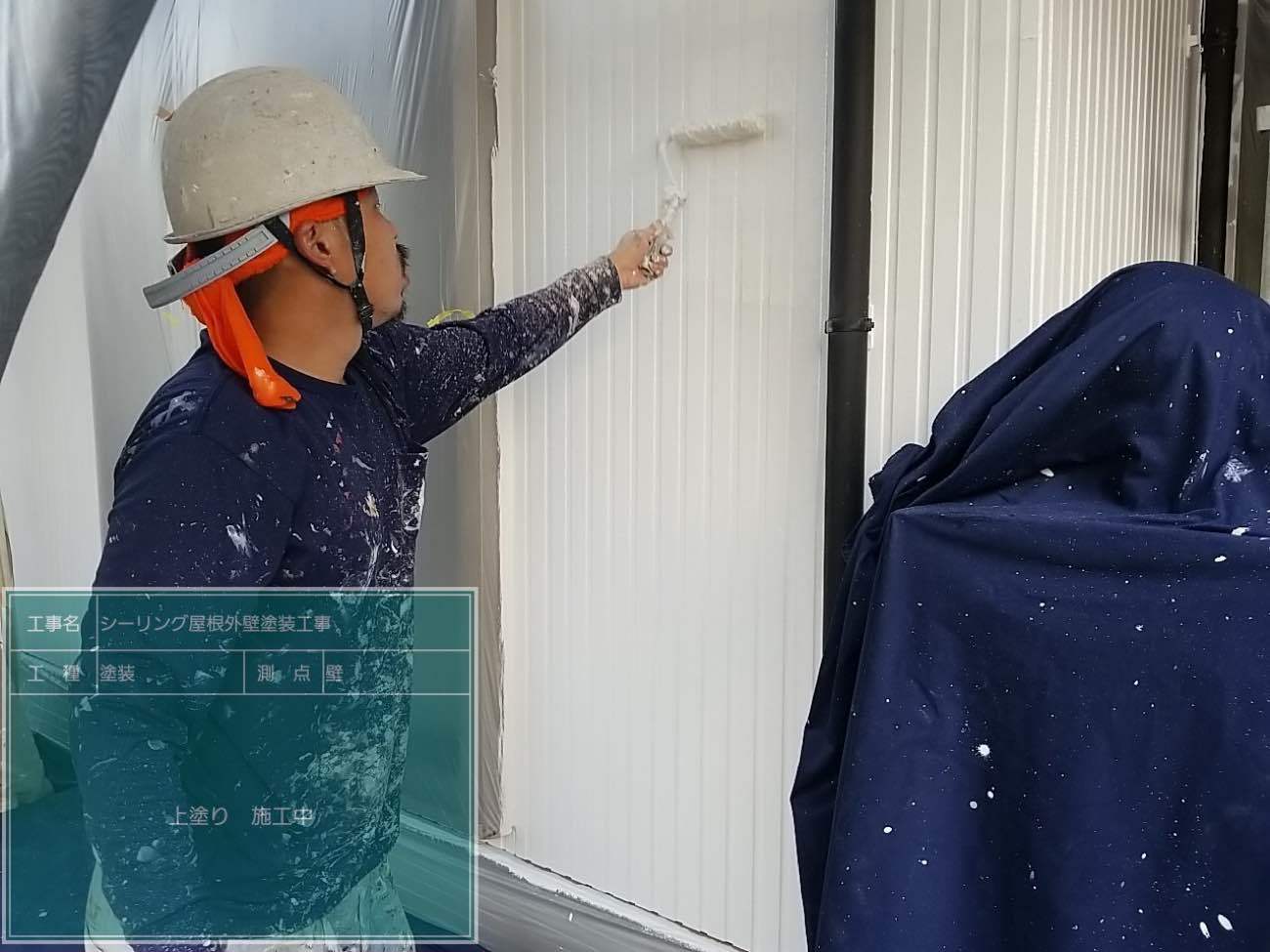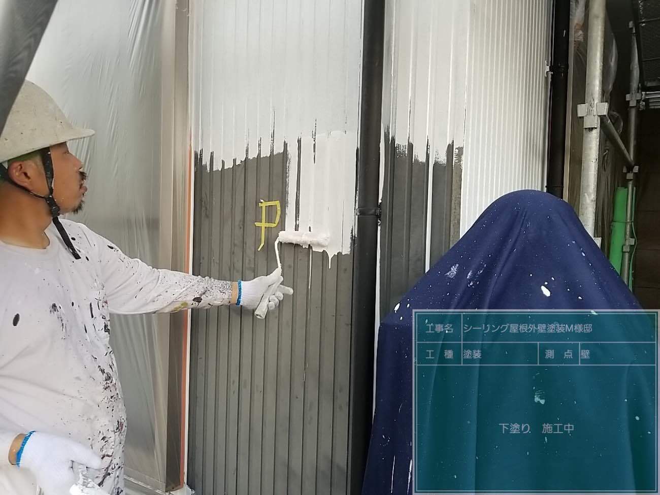 外壁の下塗り作業。飛散などの対策をしっかりとって必要な部分を丁寧に塗っていきます。