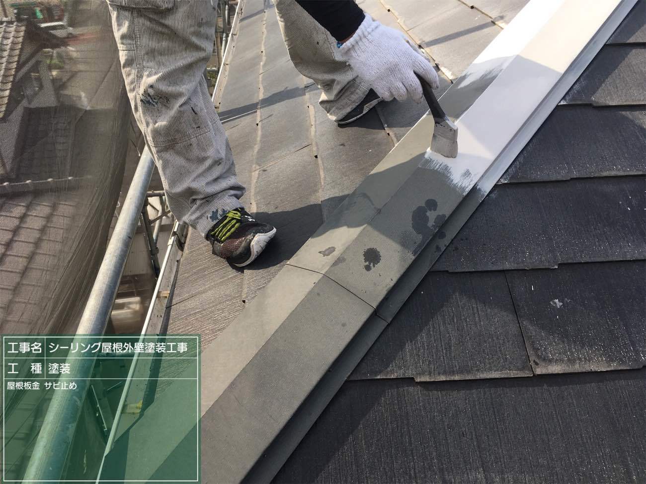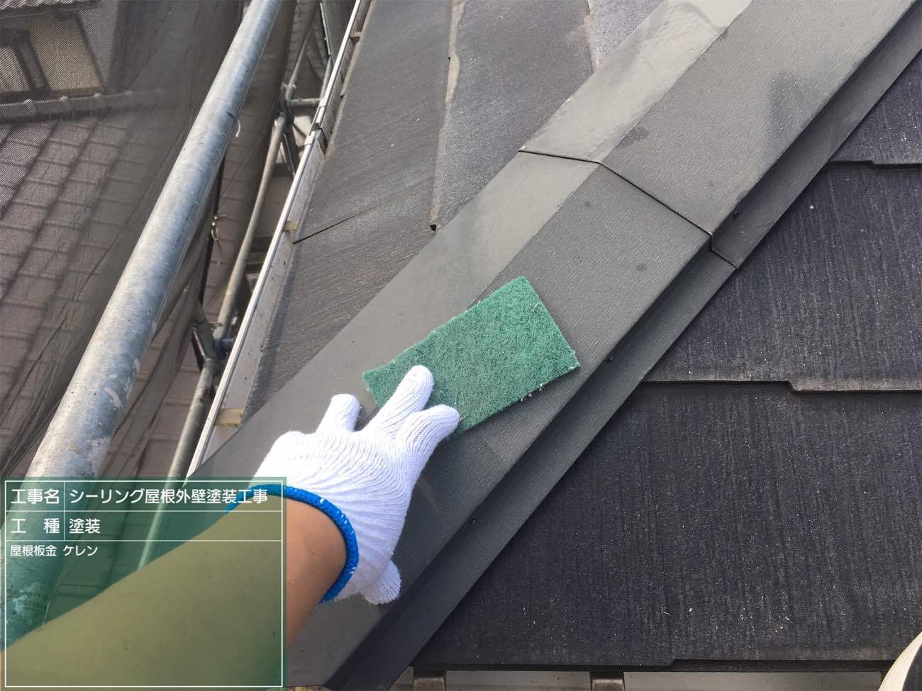 屋根の棟板板金の部分をケレンしていきます。ケレン作業は鉄部の表面に細かな傷を付けながら均す作業。この後の塗料の密着性を高める大切な作業です。