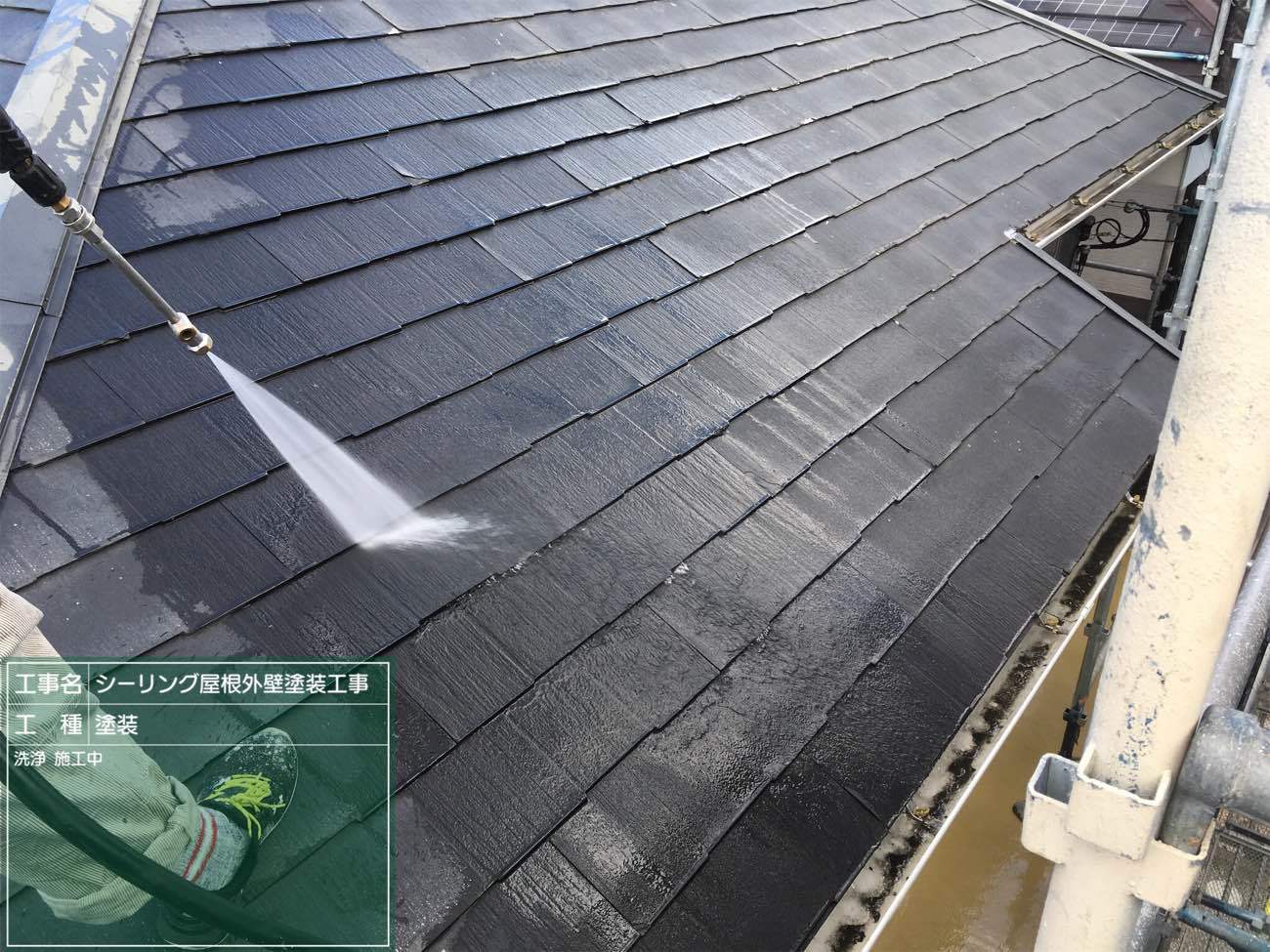 外壁同様、屋根もくまなく洗浄していきます。屋根はパッと見えないからこそしっかり行います。