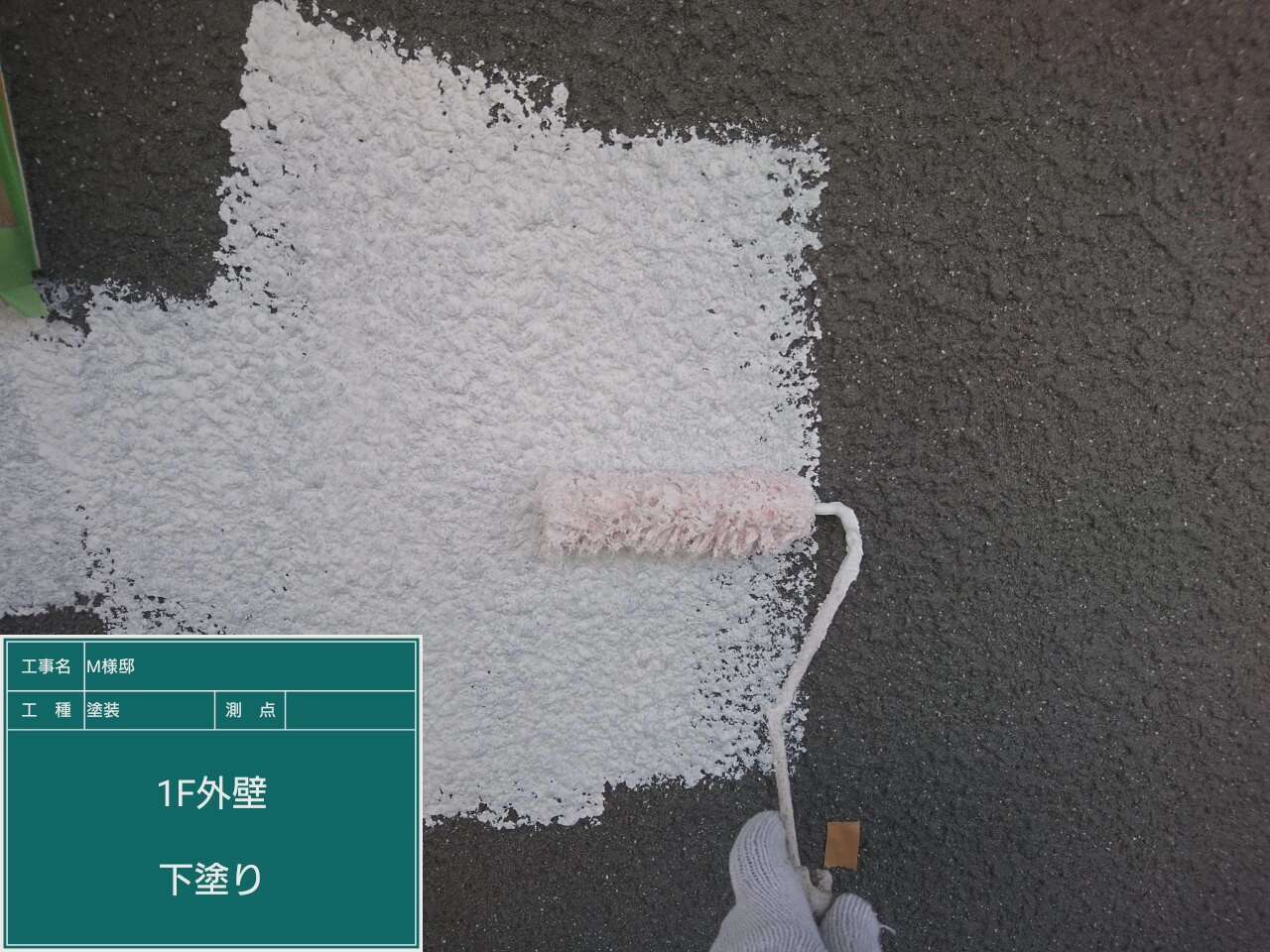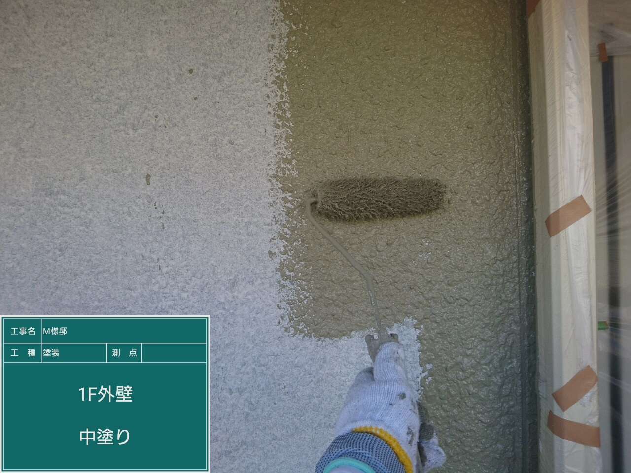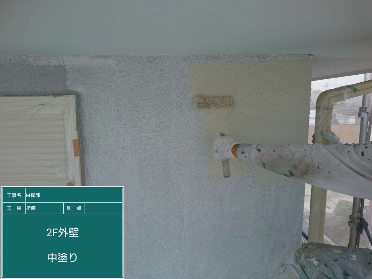 1階部分の中塗りです。中塗りは塗膜の厚みを適切に作るために必須の工程。"抜く"ことはあり得ません!