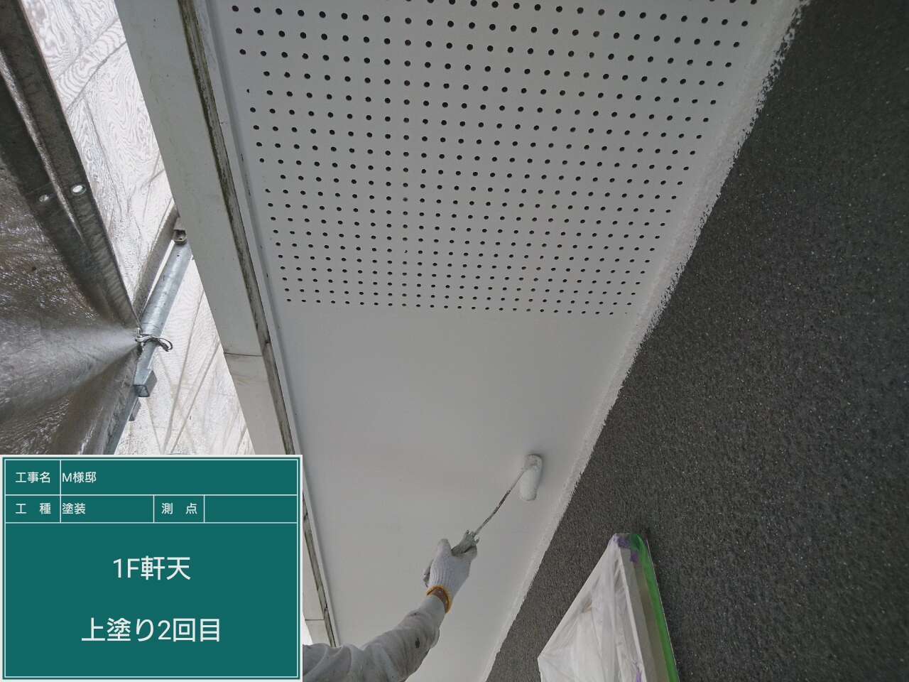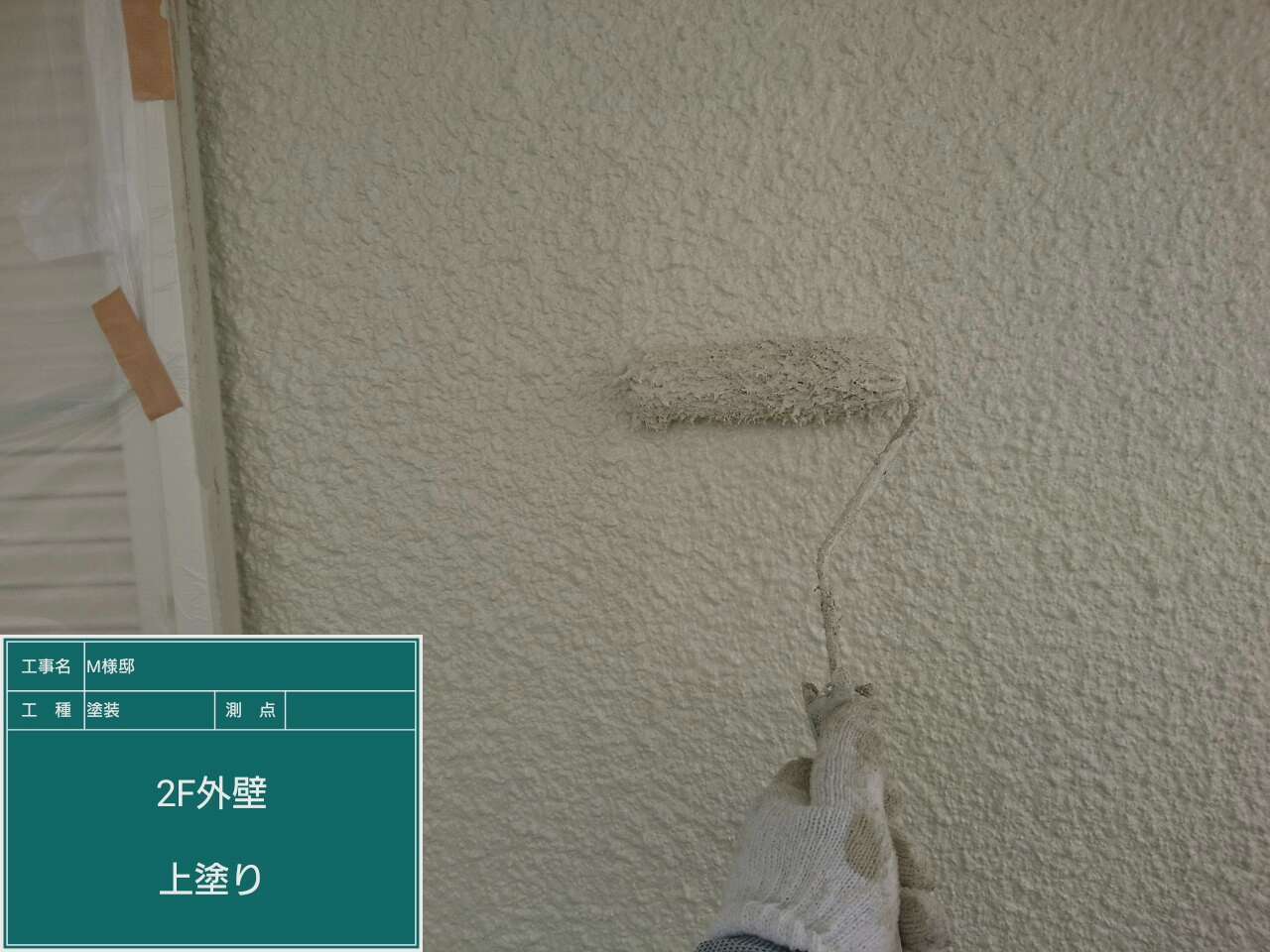 2階部分 中塗り作業です。上部もくまなく塗っていきます。