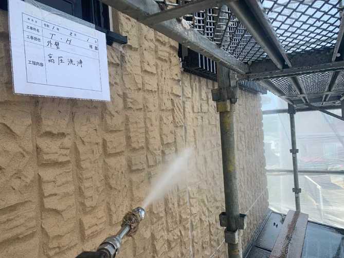 塗装に入る前に、高圧のお水で外壁についた汚れをしっかりと洗い流します。