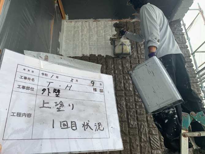 外壁の中塗り作業の様子です。 中塗り材と上塗り材、同じ塗料を使用する場合は上塗り1回目と表現することもあります。