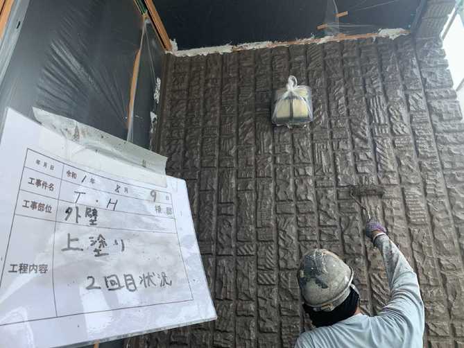 上塗り作業2回目の様子です。 仕上げの作業となっています。 見た目はもちろん耐候性に直接かかわる重要な工程です。