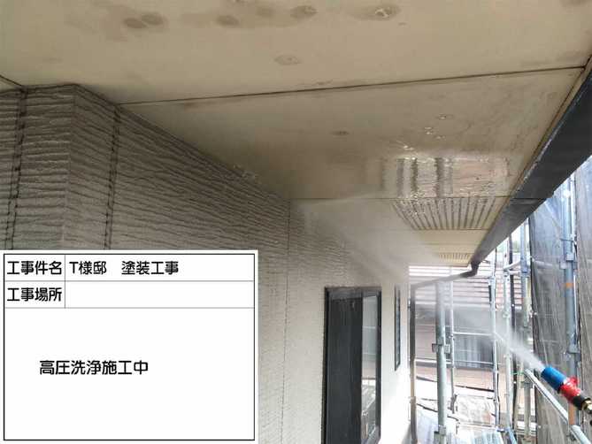 軒天もしっかりと洗浄していきます。汚れ、コケ、カビなど綺麗に洗い流しましょう。