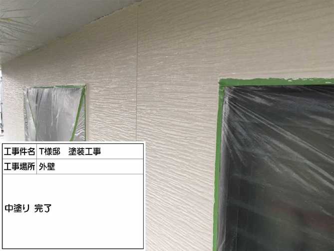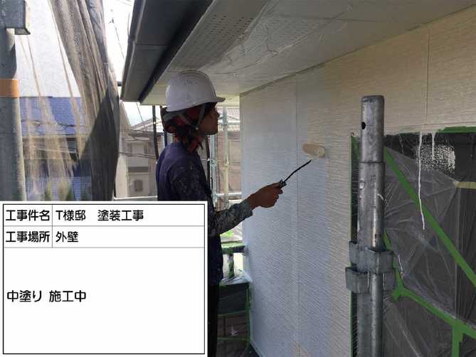 中塗り作業で塗膜に厚みをもたせます。 ここではお家の傷みの状況に合わせた塗装をしていく事がカギとなります。