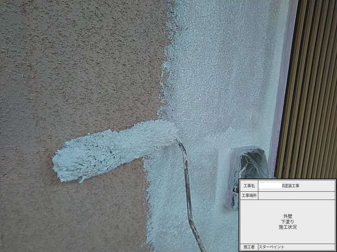 ひび割れの補修をしっかりと行った後、いよいよ塗装に入ります。 今回使用した下塗り材はフィラー、シーラー両方の機能を兼ねており、リシンにも適した下塗り材です。