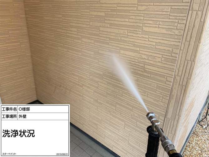 洗浄作業で外壁の汚れをきれいに洗い流します。