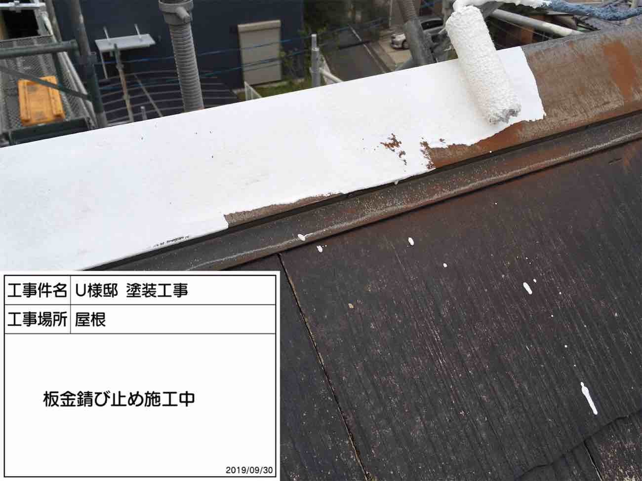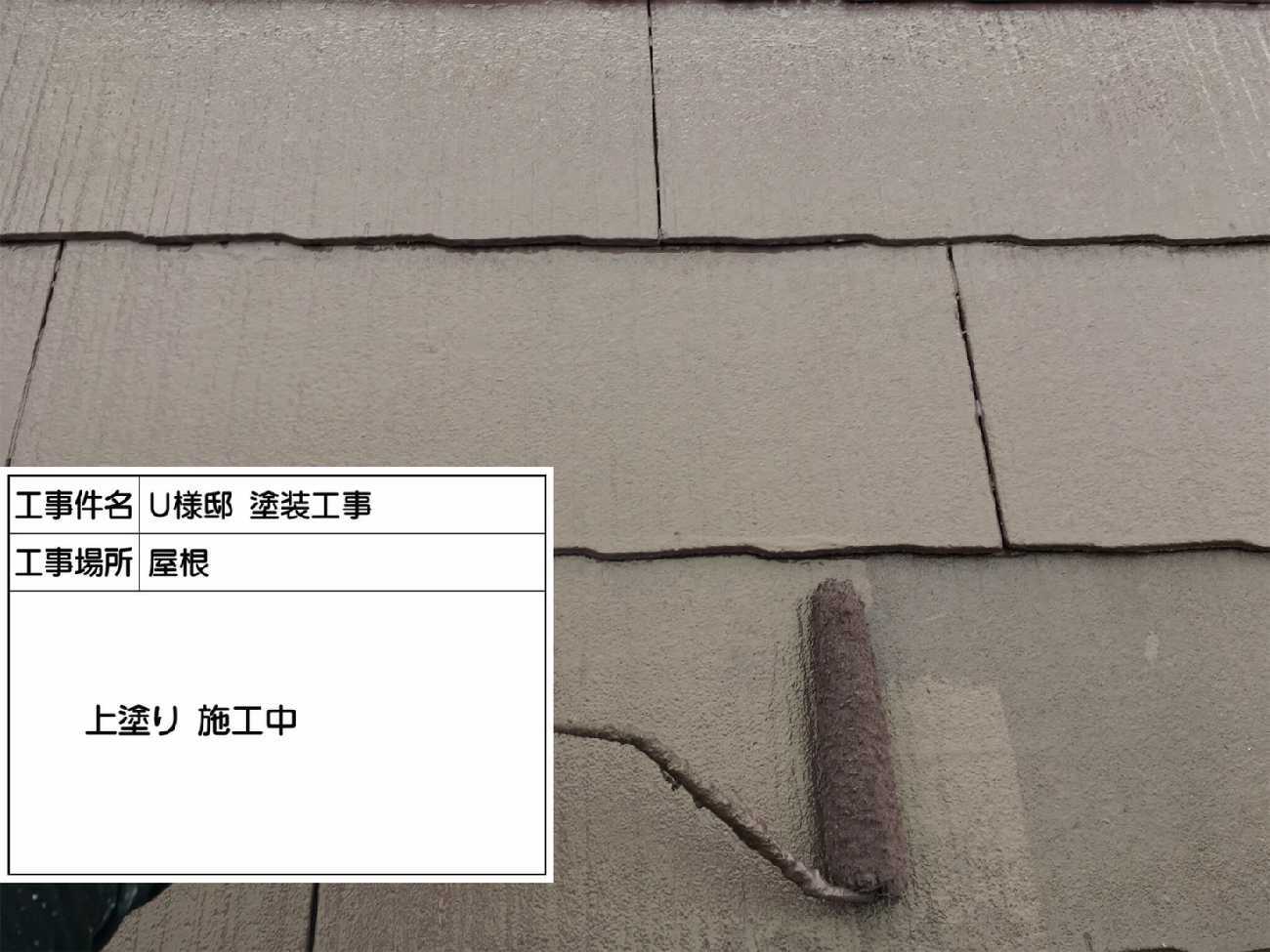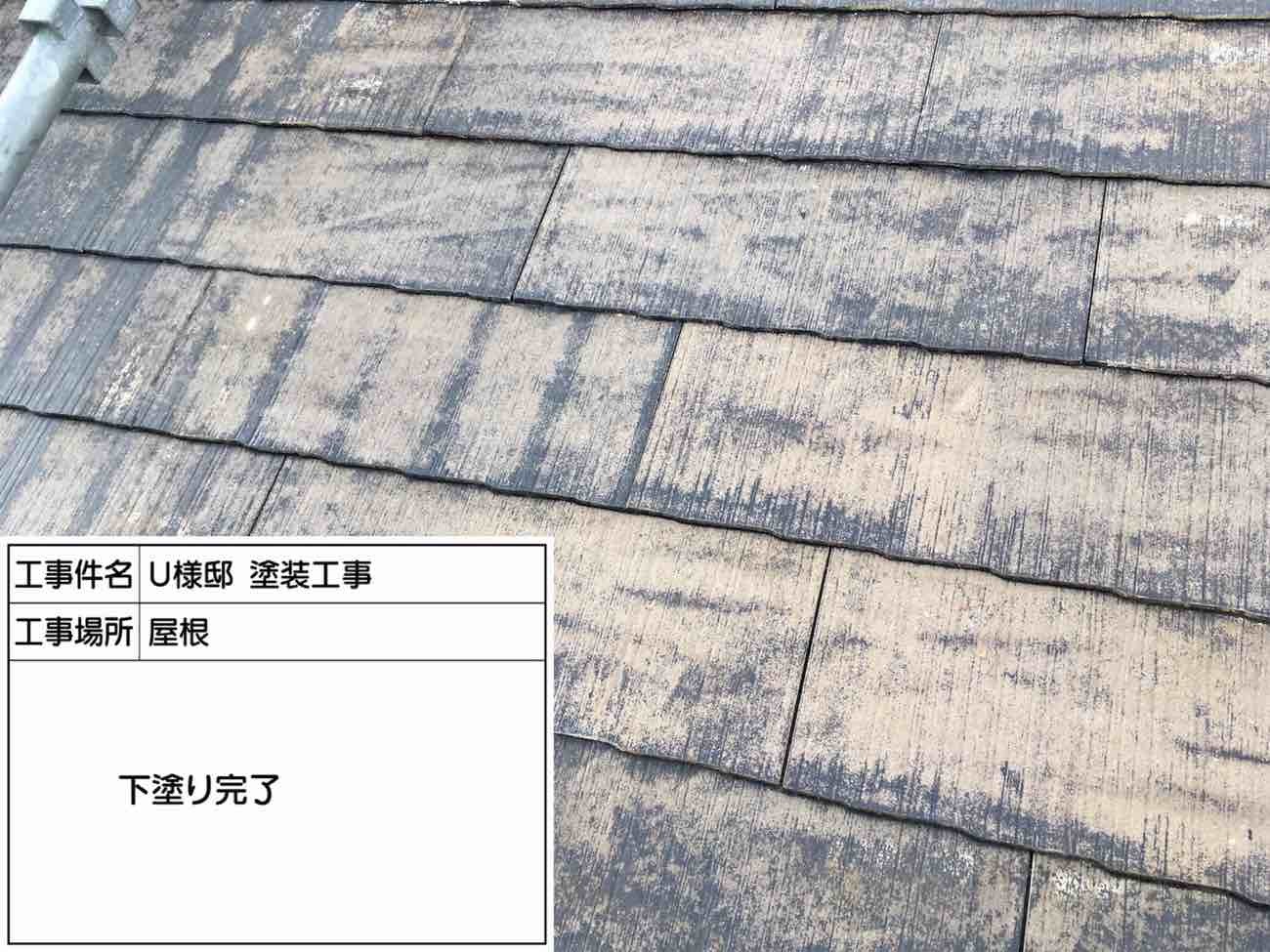 屋根の下塗り工程です。外壁と違い透明の下地材ですが、塗り残しのないように細部まで塗っていきます。