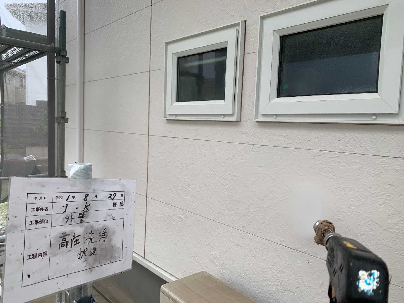 外壁の塗装作業前に、高圧洗浄で汚れを綺麗に落としていきます。