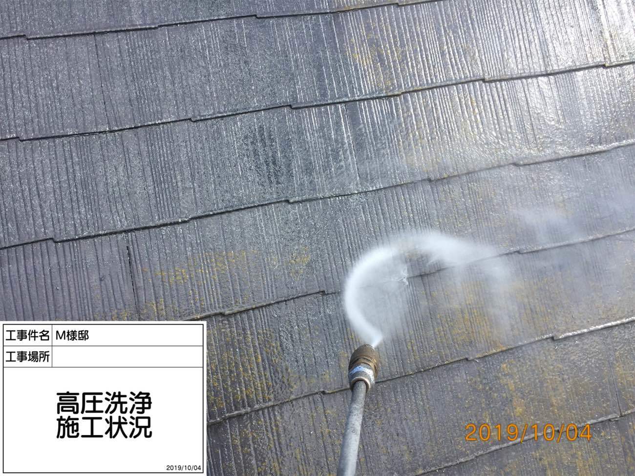 屋根を塗装する前に、高圧の水で汚れを綺麗に落としていきます。