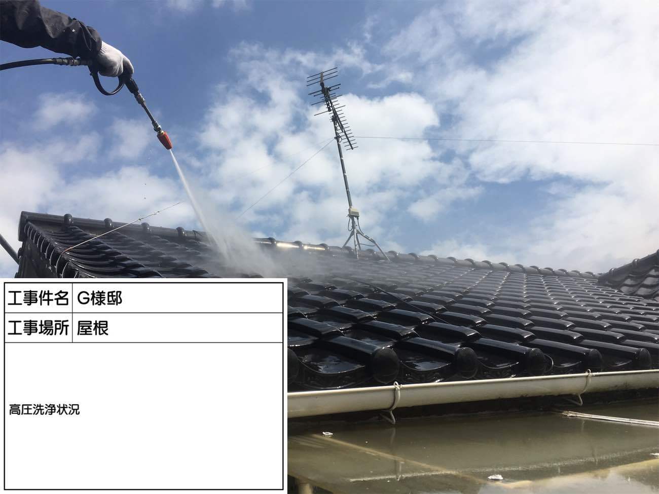 屋根も同じように高圧の水で綺麗にしていきます。