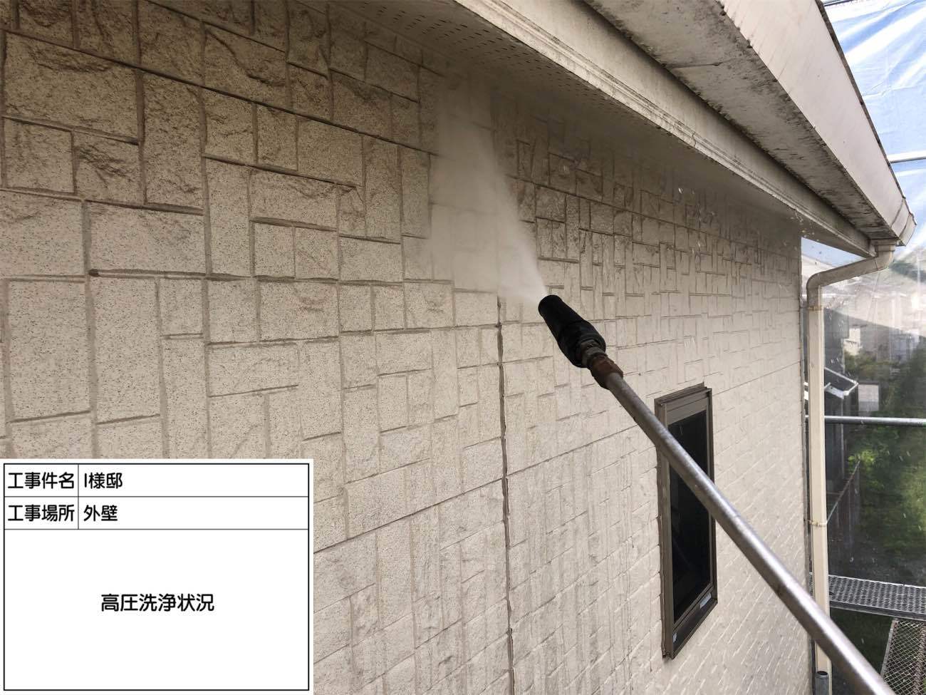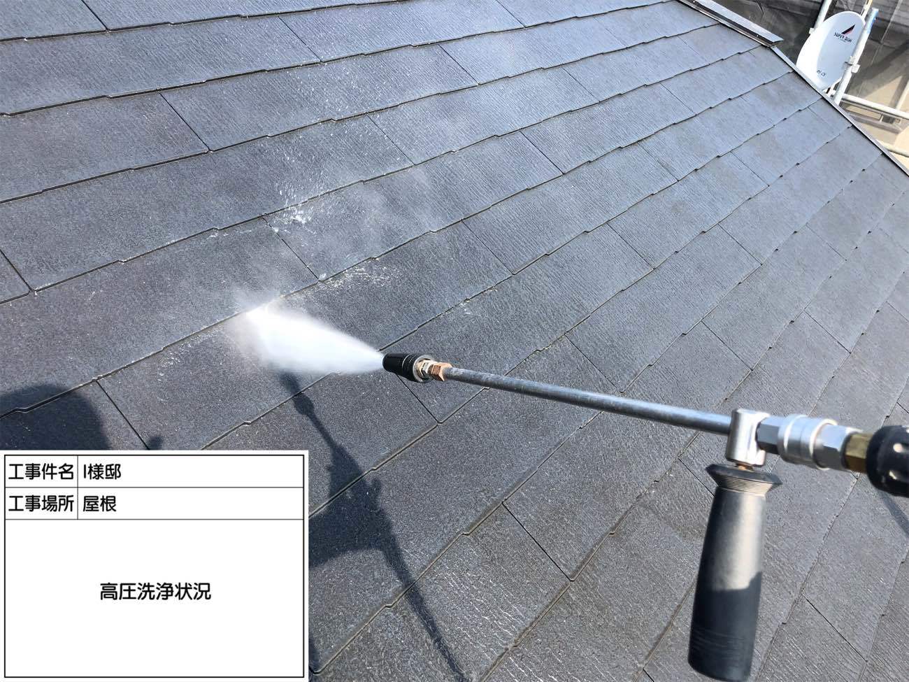 屋根も外壁も同じように高圧の水で汚れを洗浄していきます。