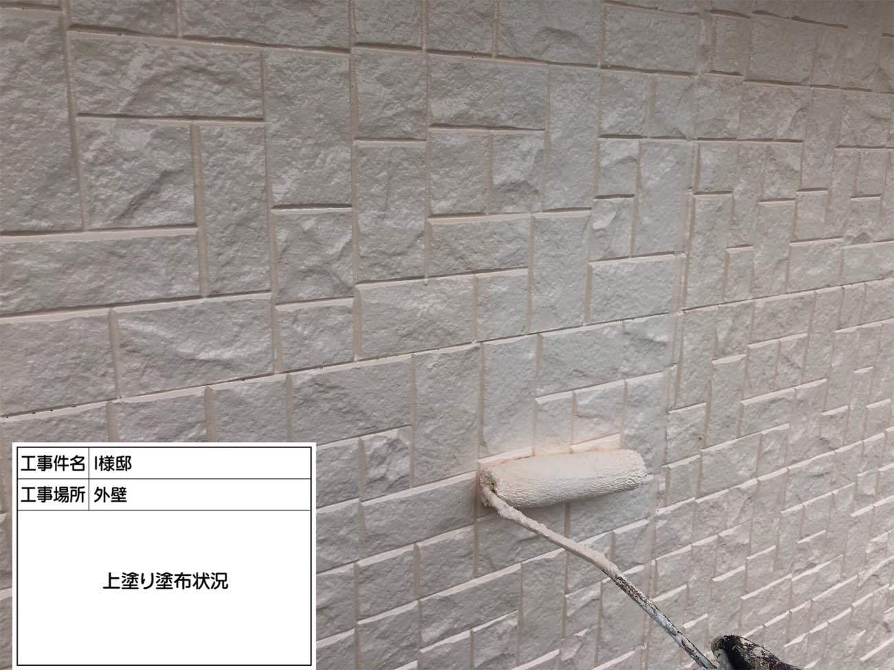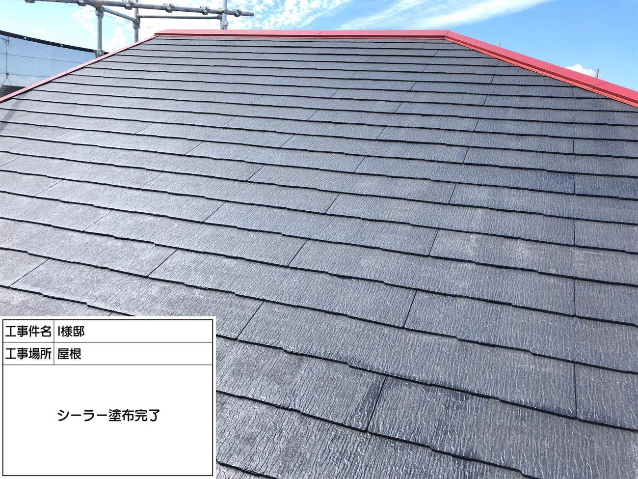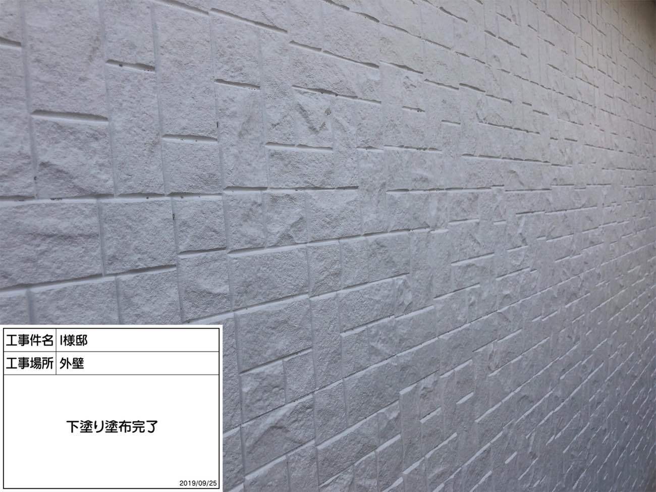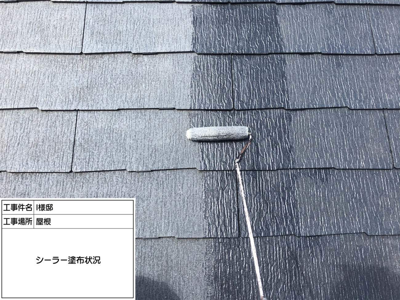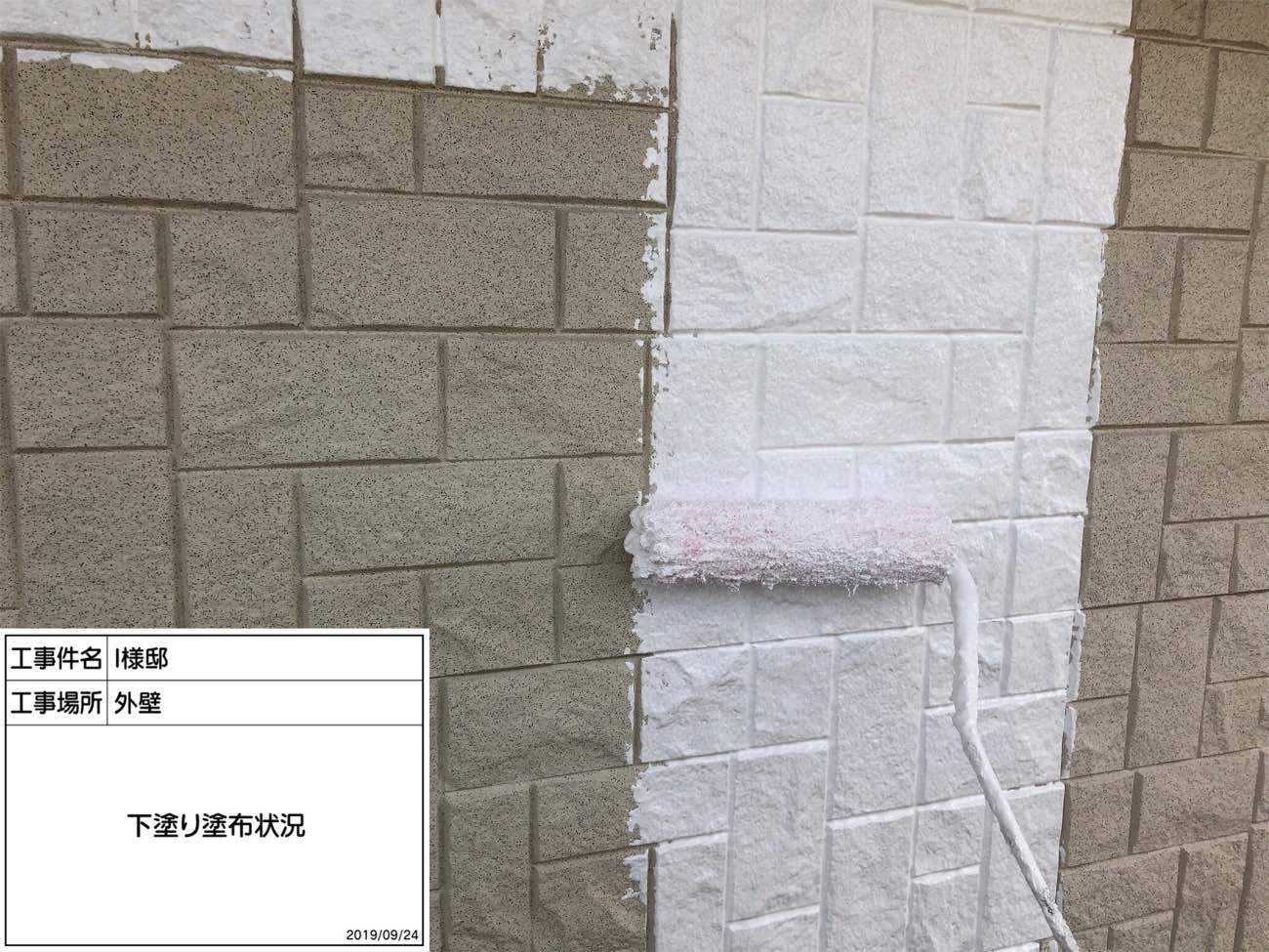 外壁の下塗りを行います。屋根も下塗りを行いましたが、下塗り工程は塗料の密着性を上げる役割を持っています。