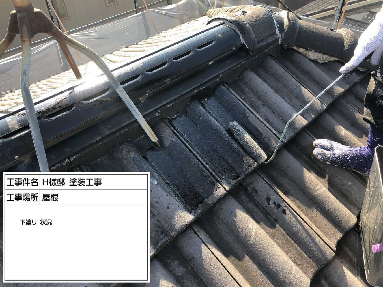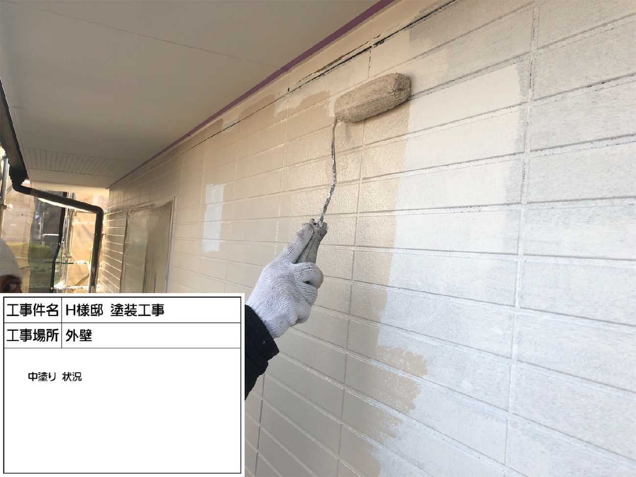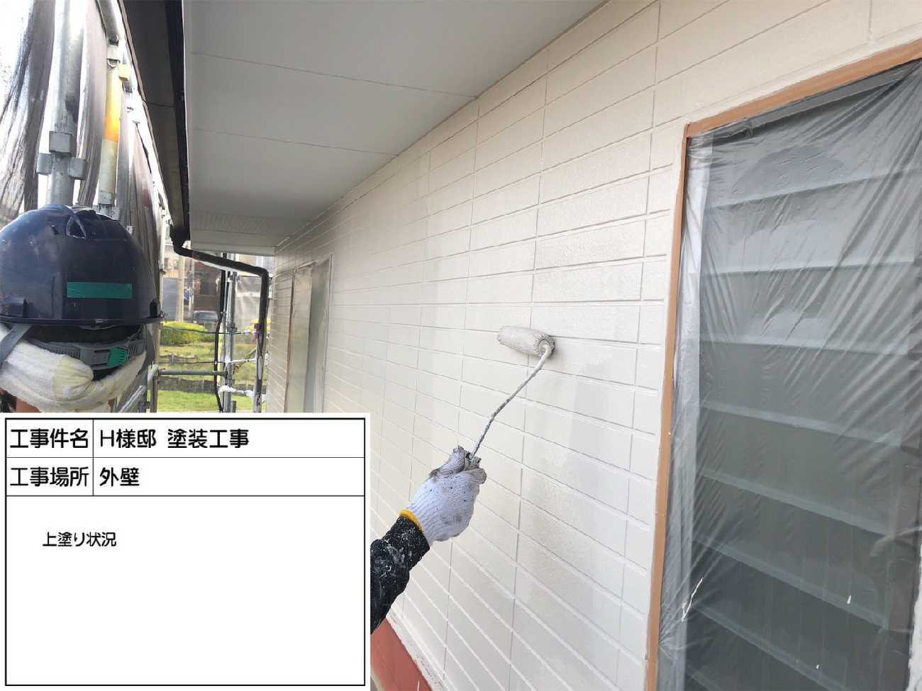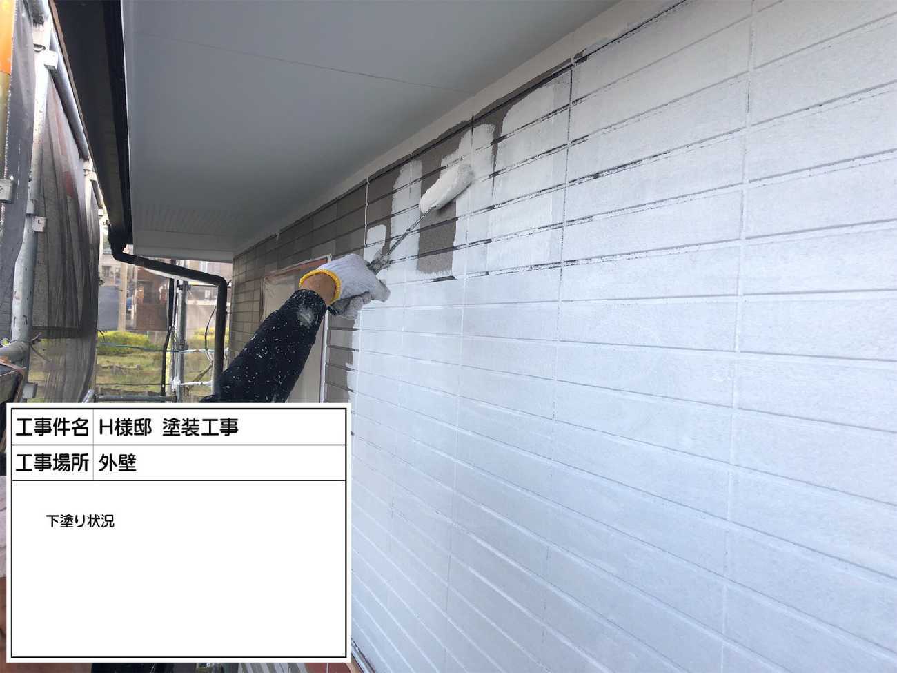 外壁の下塗り塗料は屋根と違って基本的に白色です。一度塗りつぶすようにしてから希望色を塗っていきます。