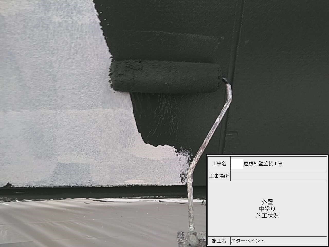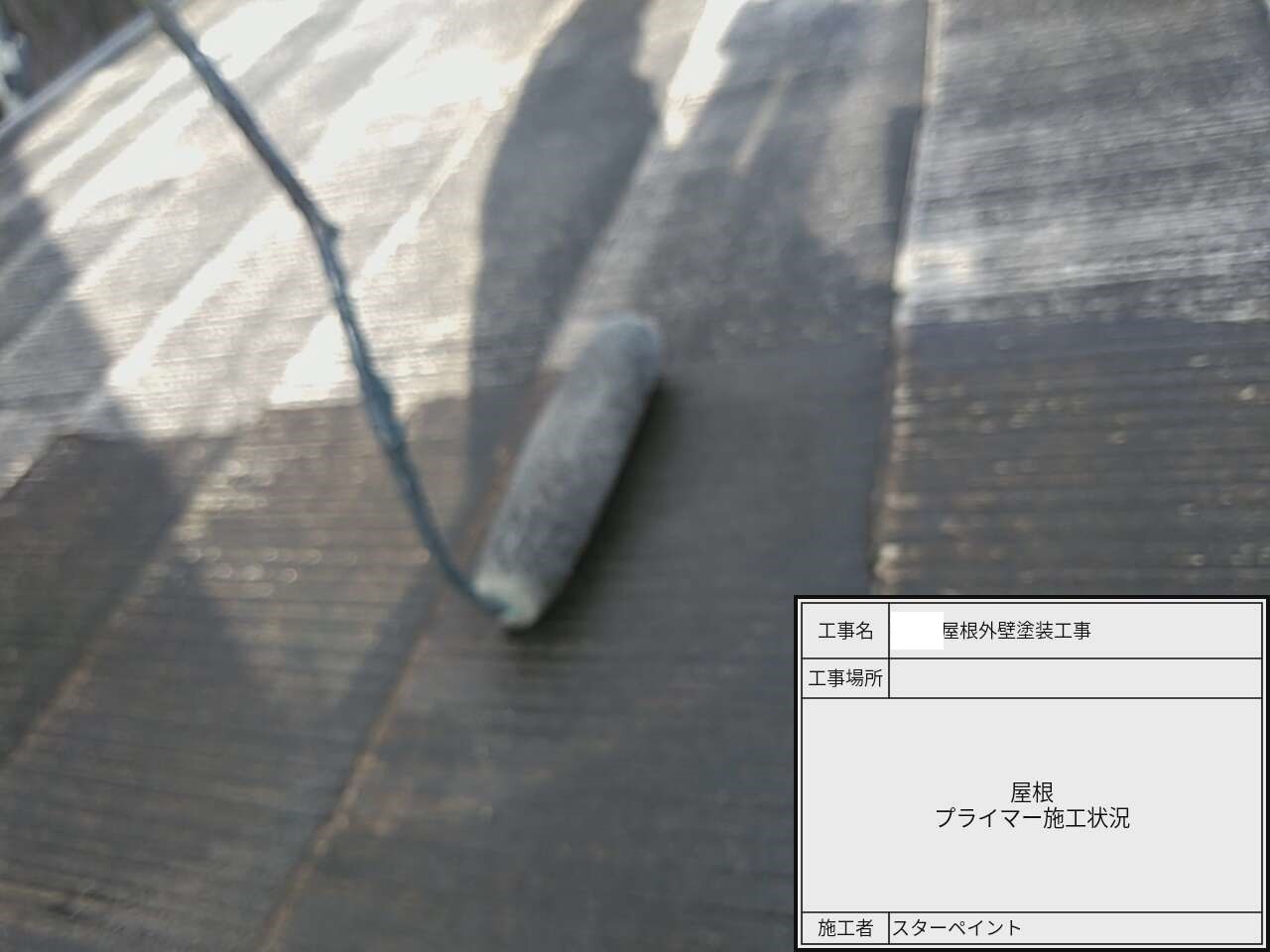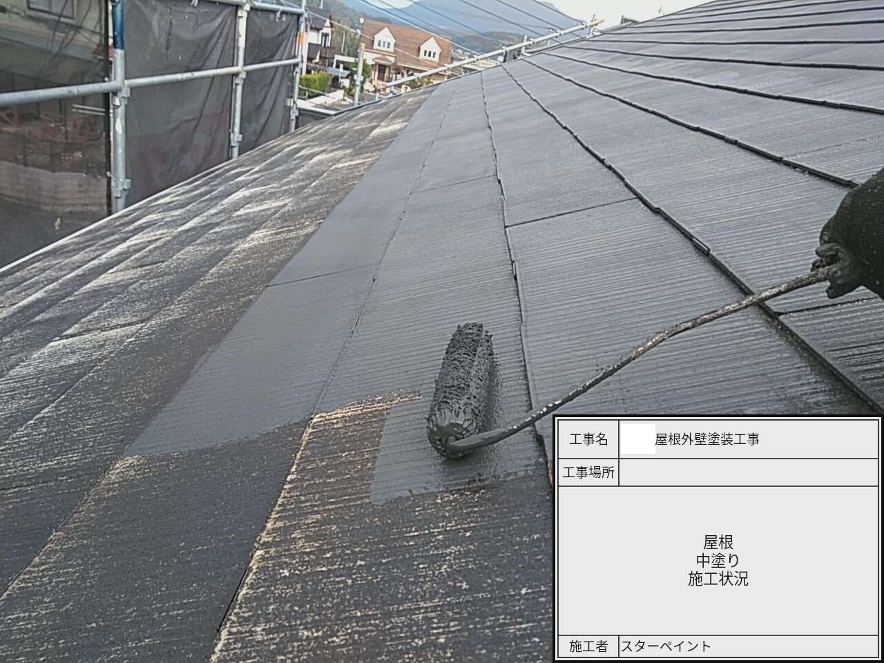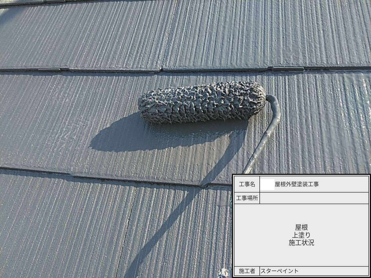 屋根の中塗り作業中です。中塗りで塗装に厚みを持たせます。