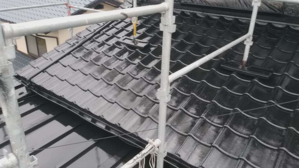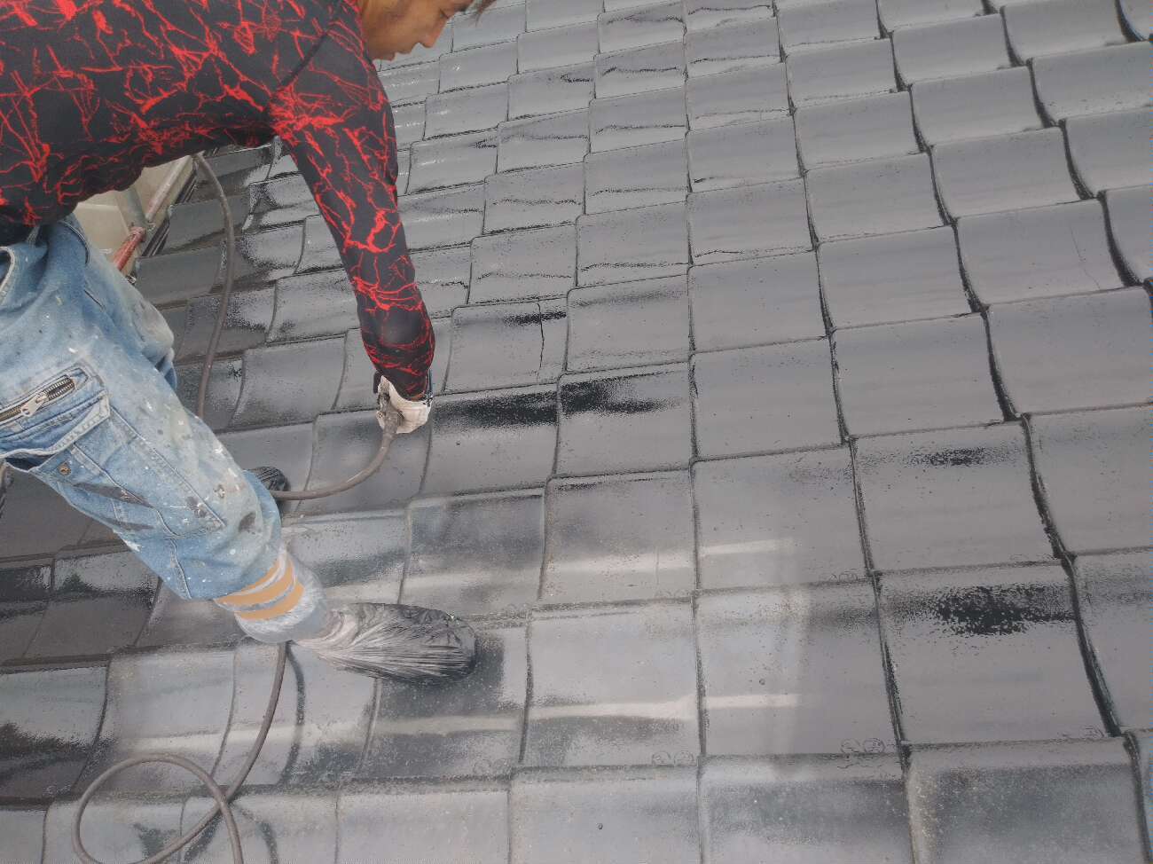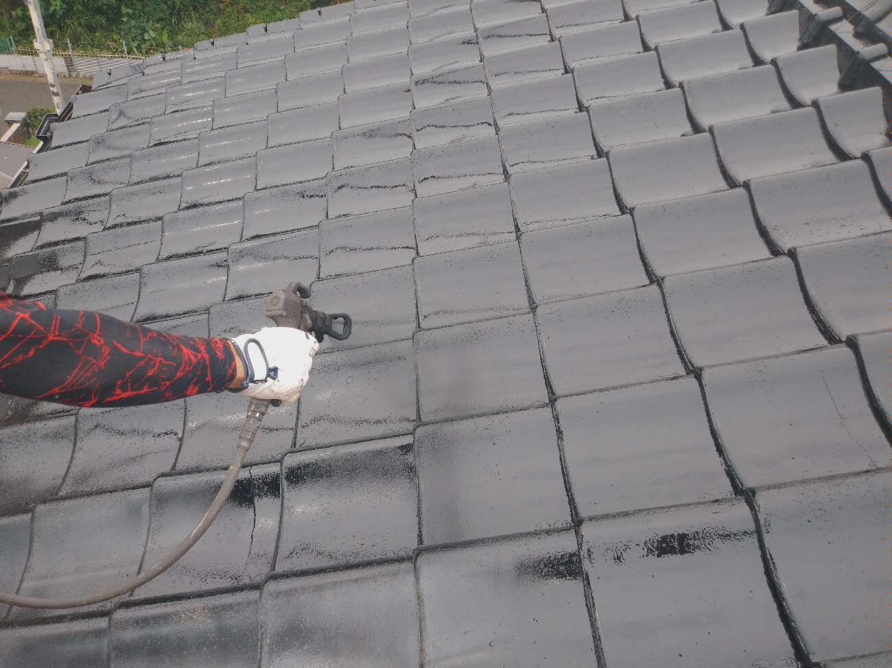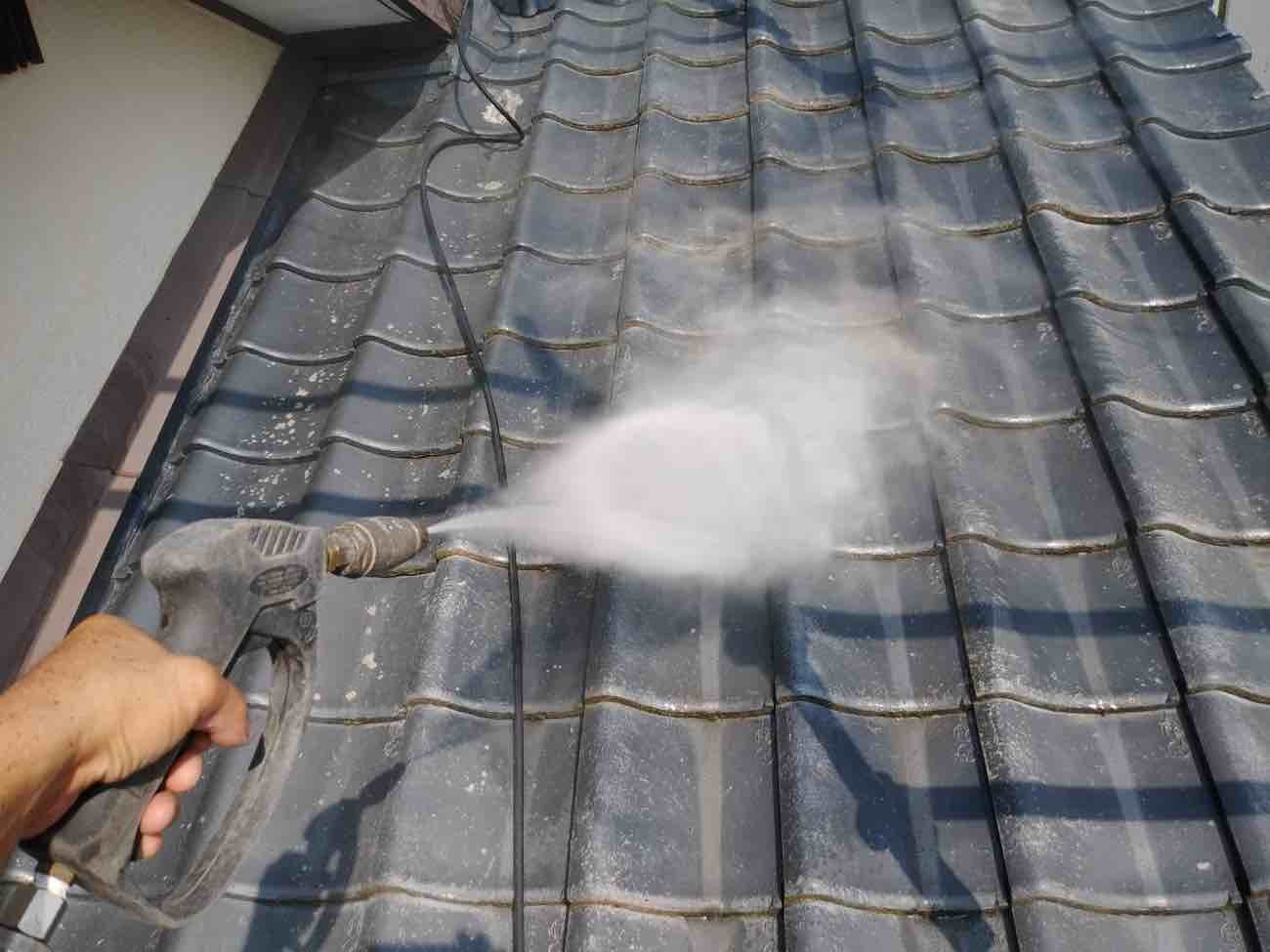 お屋根の洗浄作業の様子です。 コケや藻、カビなども徹底的に洗い流します。