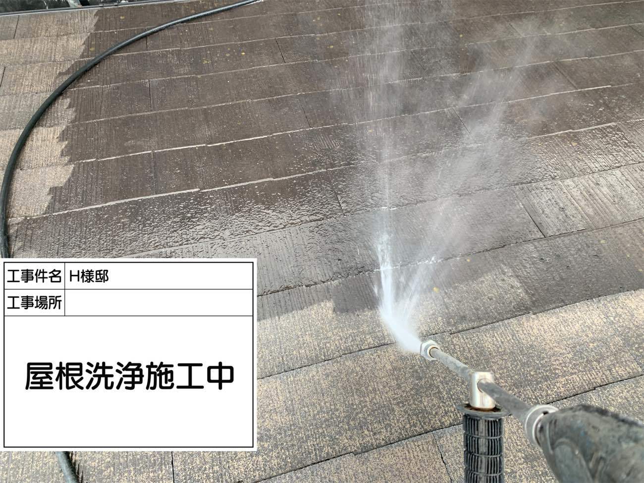 塗装作業を始める前に、屋根に付着している汚れを落としていきます。