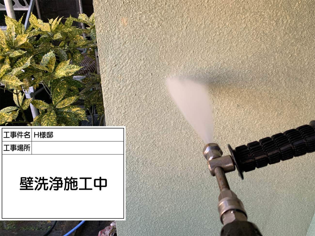 外壁も高圧洗浄で落としていきます。 汚れがついているまま塗料を塗ってしまうと汚れの上に塗膜ができはがれやすくなってしまいます。