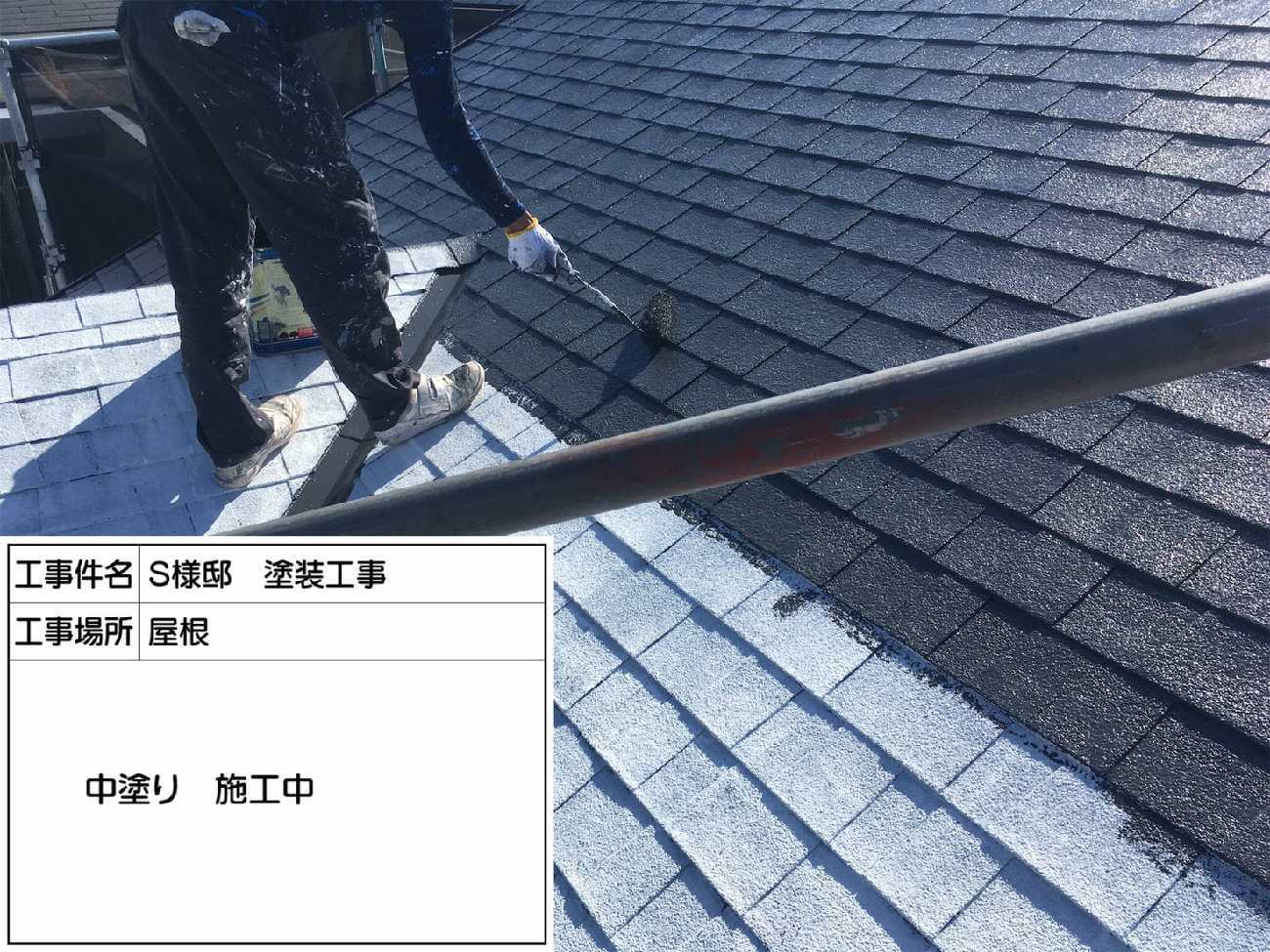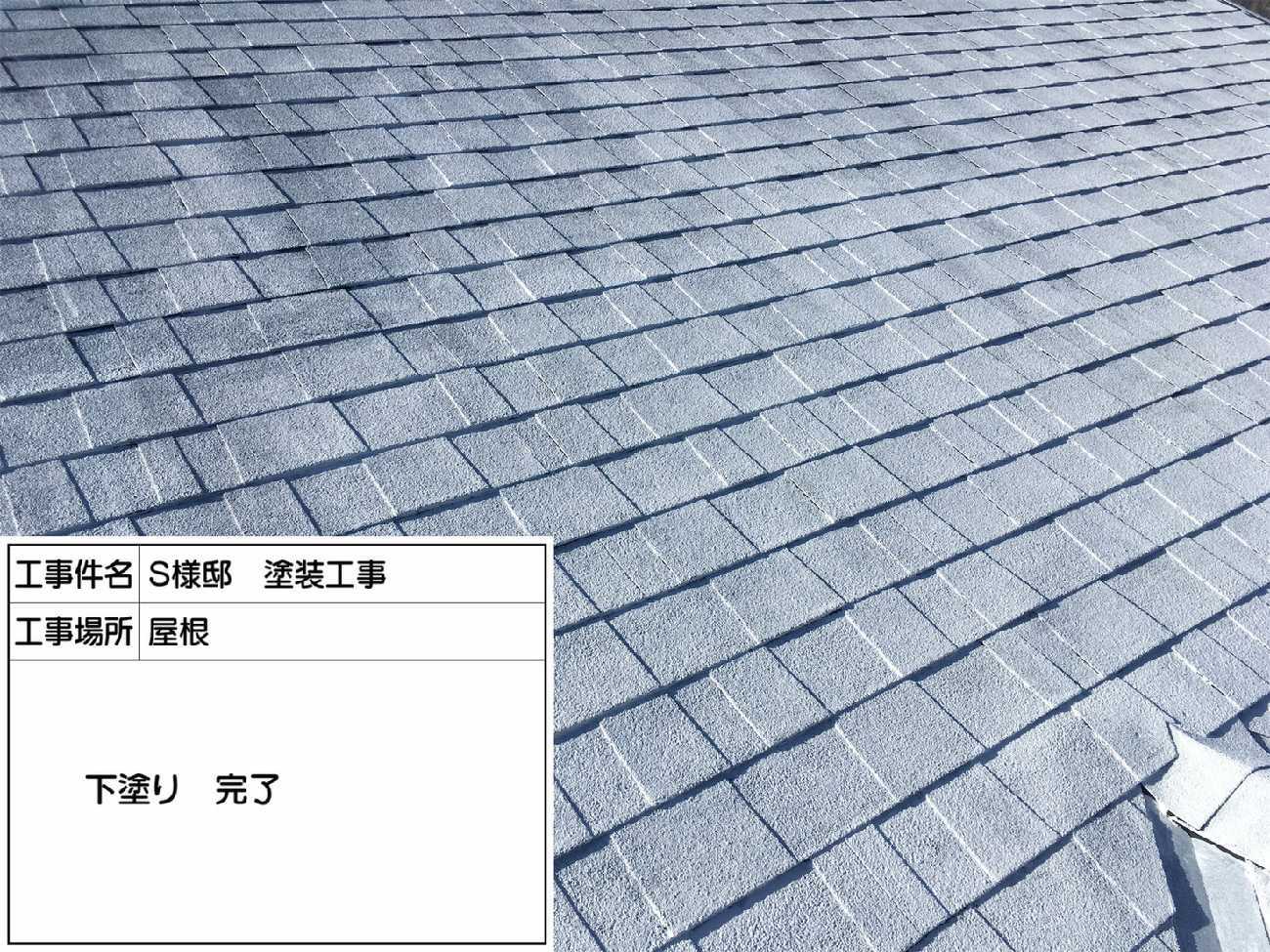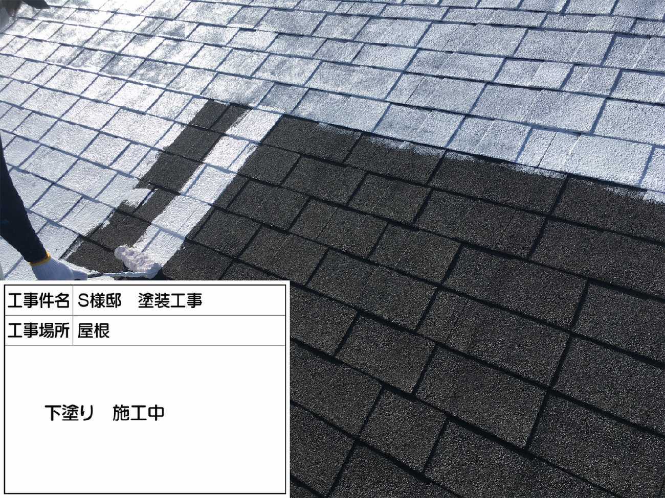 まずは、屋根の塗装の様子からご紹介します。 これは下塗りの様子です。下塗りは下地と塗料の密着性を高めます。