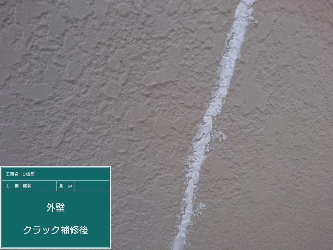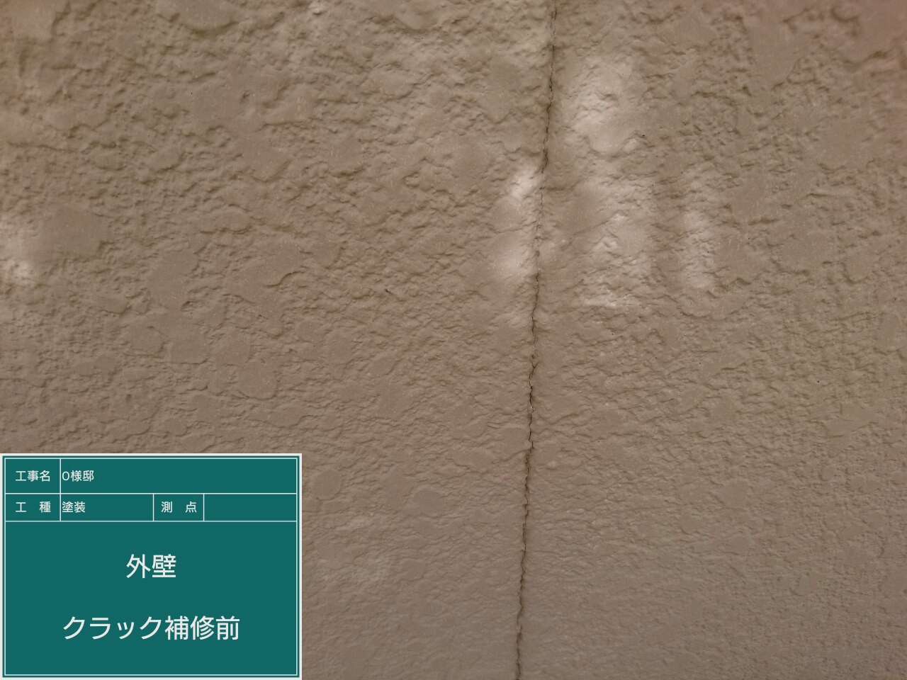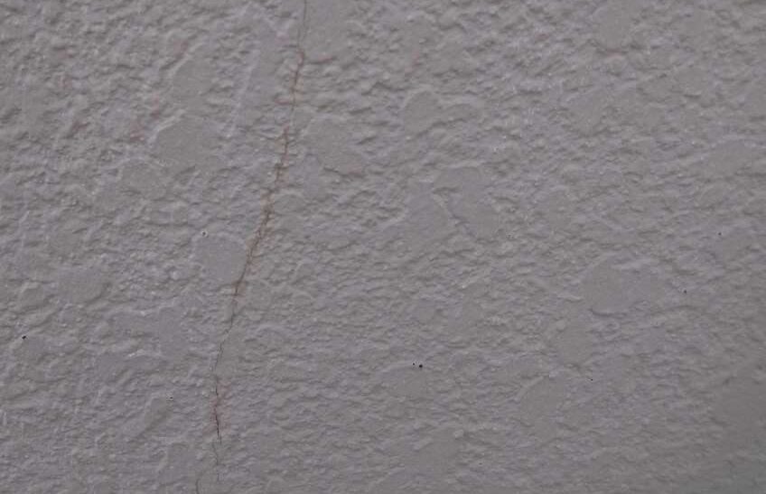 補修箇所がある場合、補修作業は塗装工事の前の段階で行います。中央に見えるのは目地ではなくクラックと呼ばれるひび割れです。