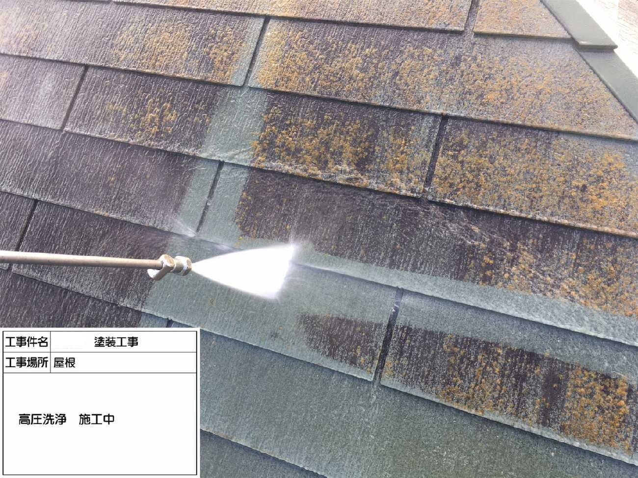 屋根も洗浄していきます。 写真のようにコケなどの汚れがついているため高圧の水で落としています。