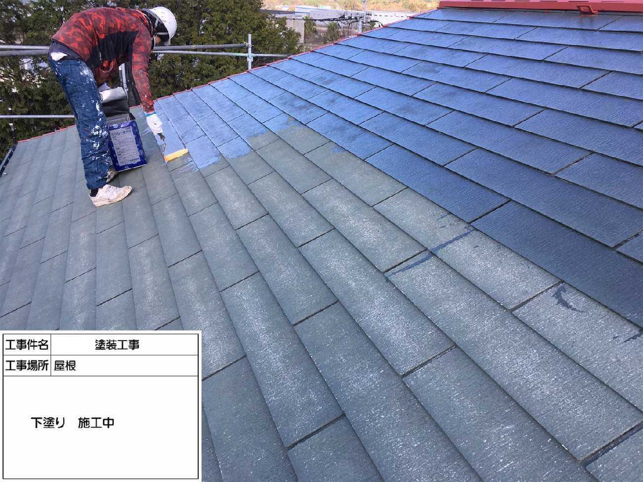 屋根の下塗り作業です。 屋根も下塗り・中塗り・上塗り作業を行います。