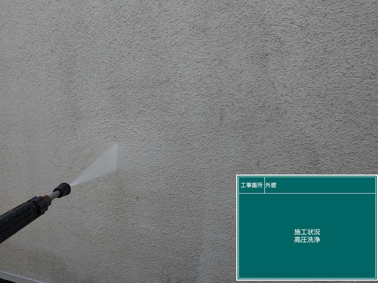 外壁と屋根の塗装様子をご紹介していきます。 まず初めに塗料を塗っていく前に、洗浄作業を行っていきます。