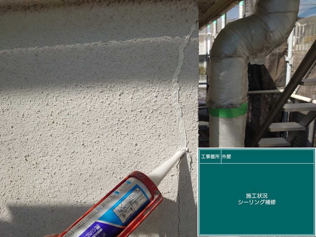 洗浄が完了し、しっかり乾燥させたら塗装に参りたいところですが。 今回、外壁にクラック(ひび割れ)が発生しておりましたので、シーリング剤で外壁を補修していきます。