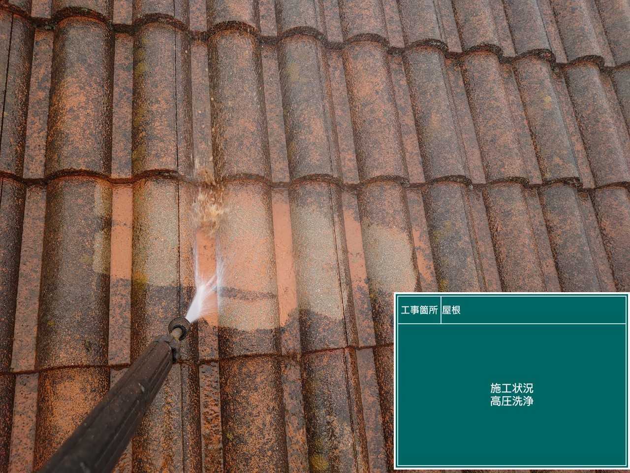 外壁、屋根ともに高圧洗浄機の水圧で外壁や屋根に付着している汚れを落としていきます。