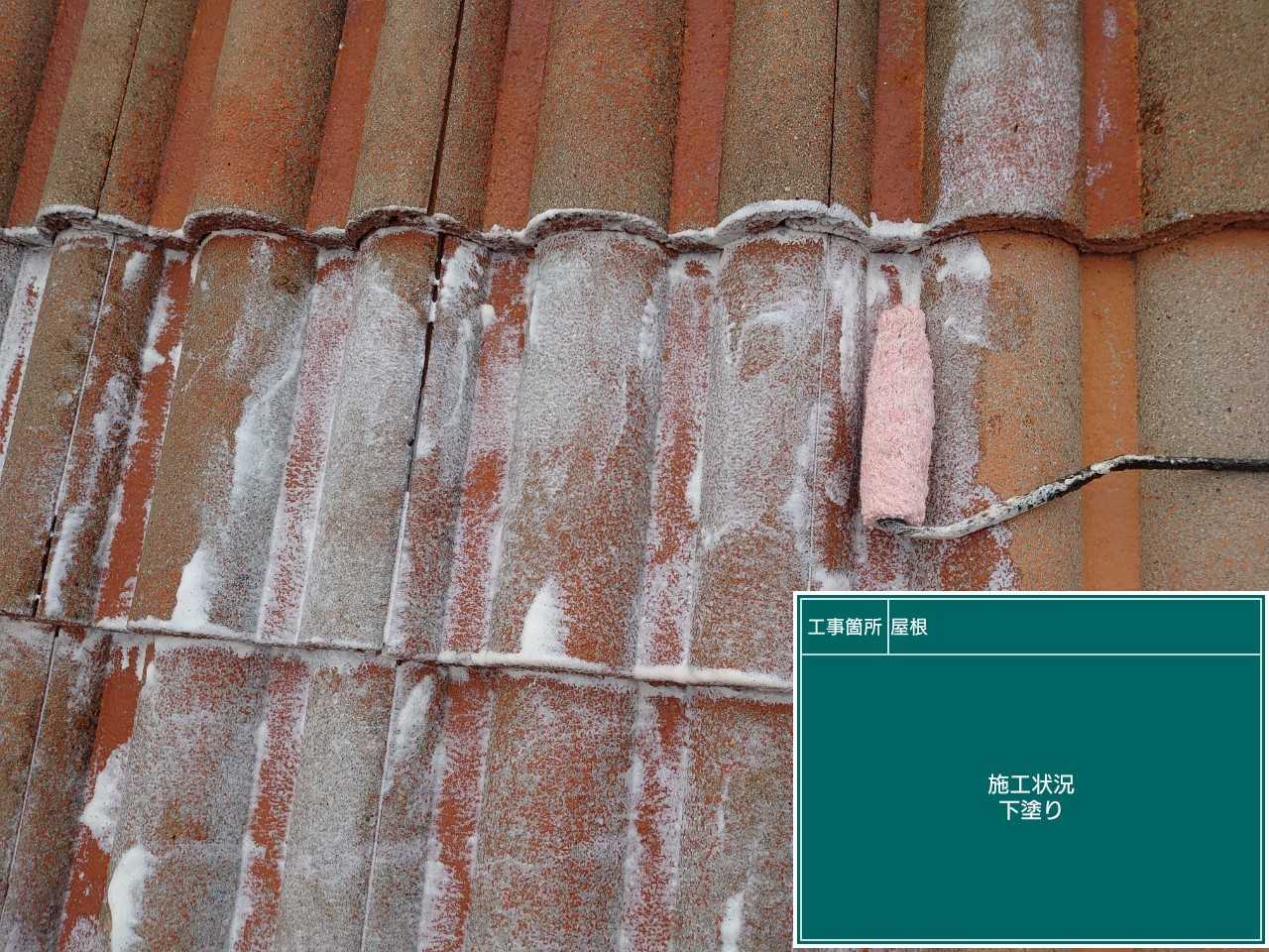屋根も塗装していきます。外壁と同じように3回塗りをしていきます。 これは下塗り作業です。