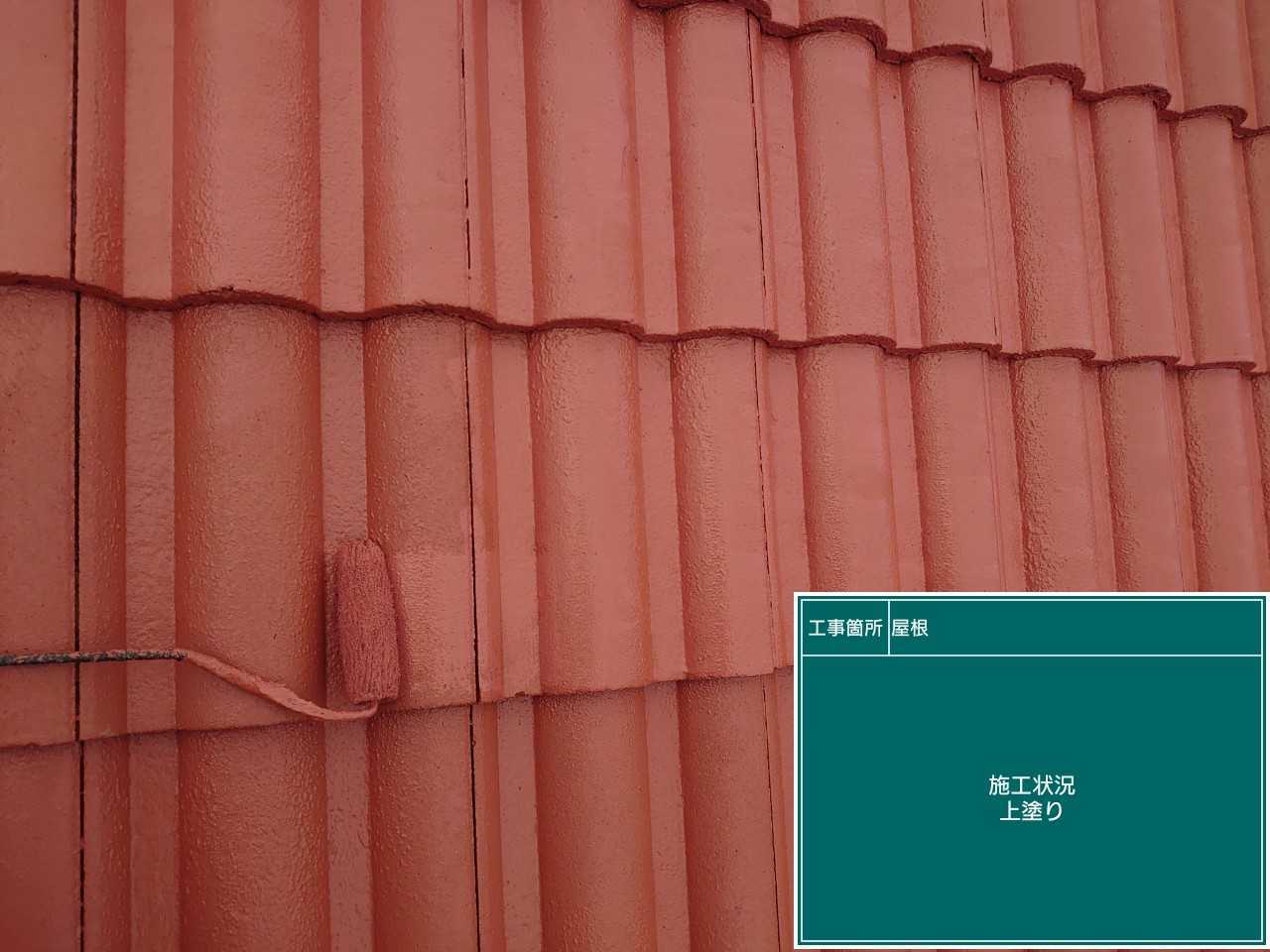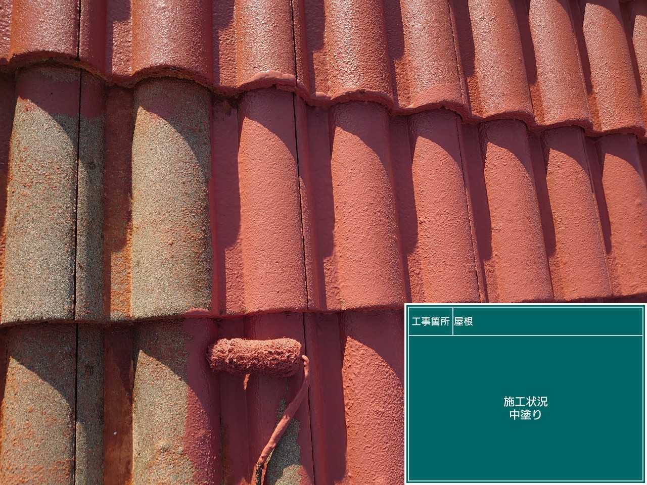 中塗りの様子です。屋根は紫外線を受けやすいため、ムラができてしまうと劣化が早まったりするため きちんと綺麗に塗っていきます。