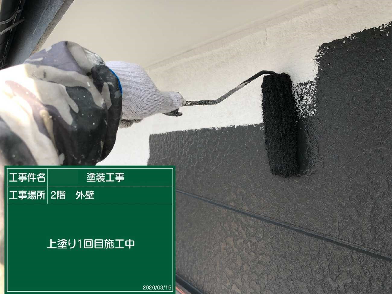一回目の上塗りです。先ほどの1階部分とは対照的な濃い目の色になっていますね。
