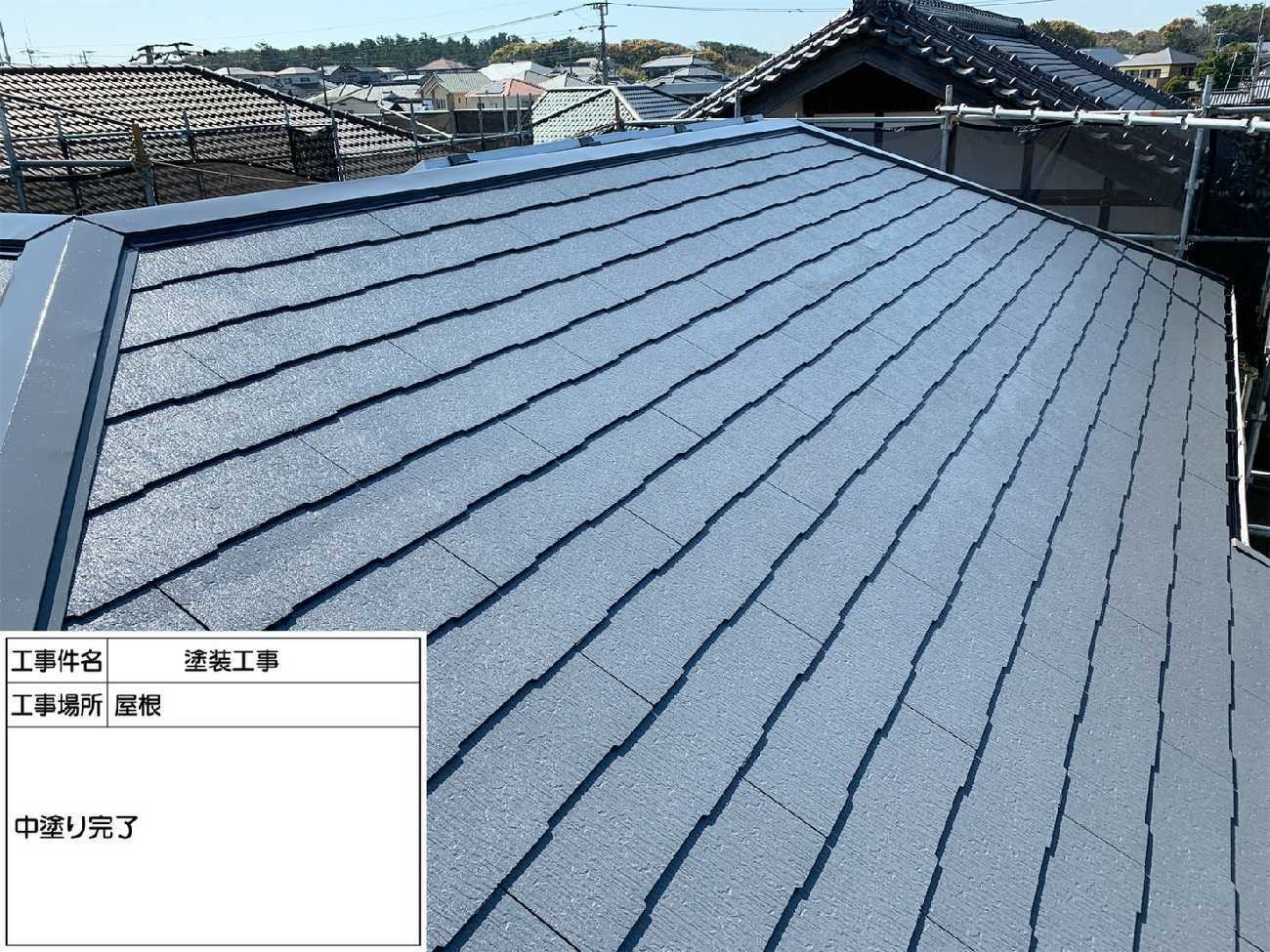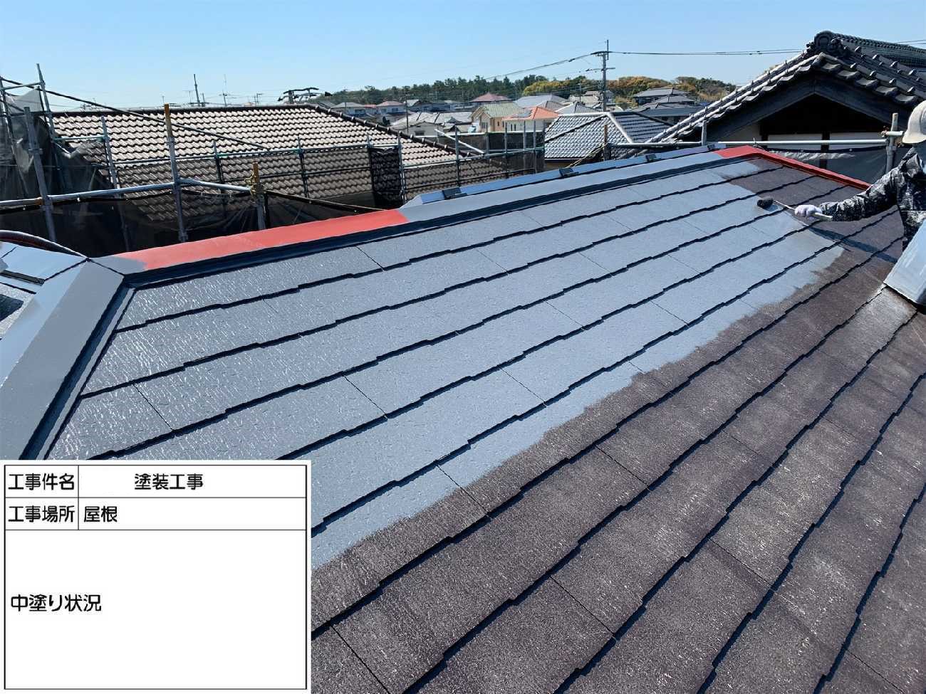 屋根の中塗りの作業です。中塗り作業では上塗りを行う前にもう一段階塗装をしていきます。