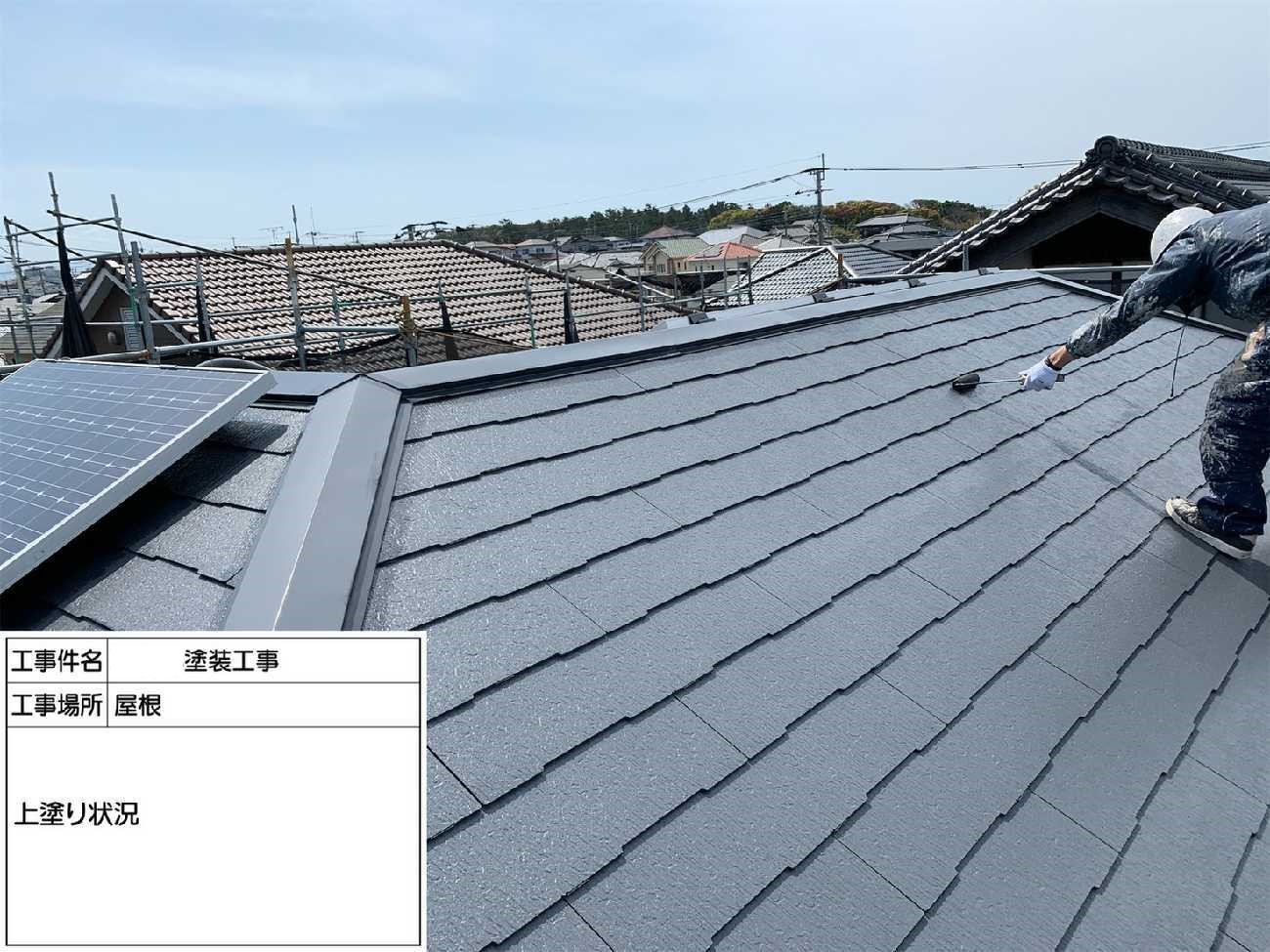 屋根の上塗り作業です。上塗りでは先ほどの中塗りの上からさらに塗装を行います。