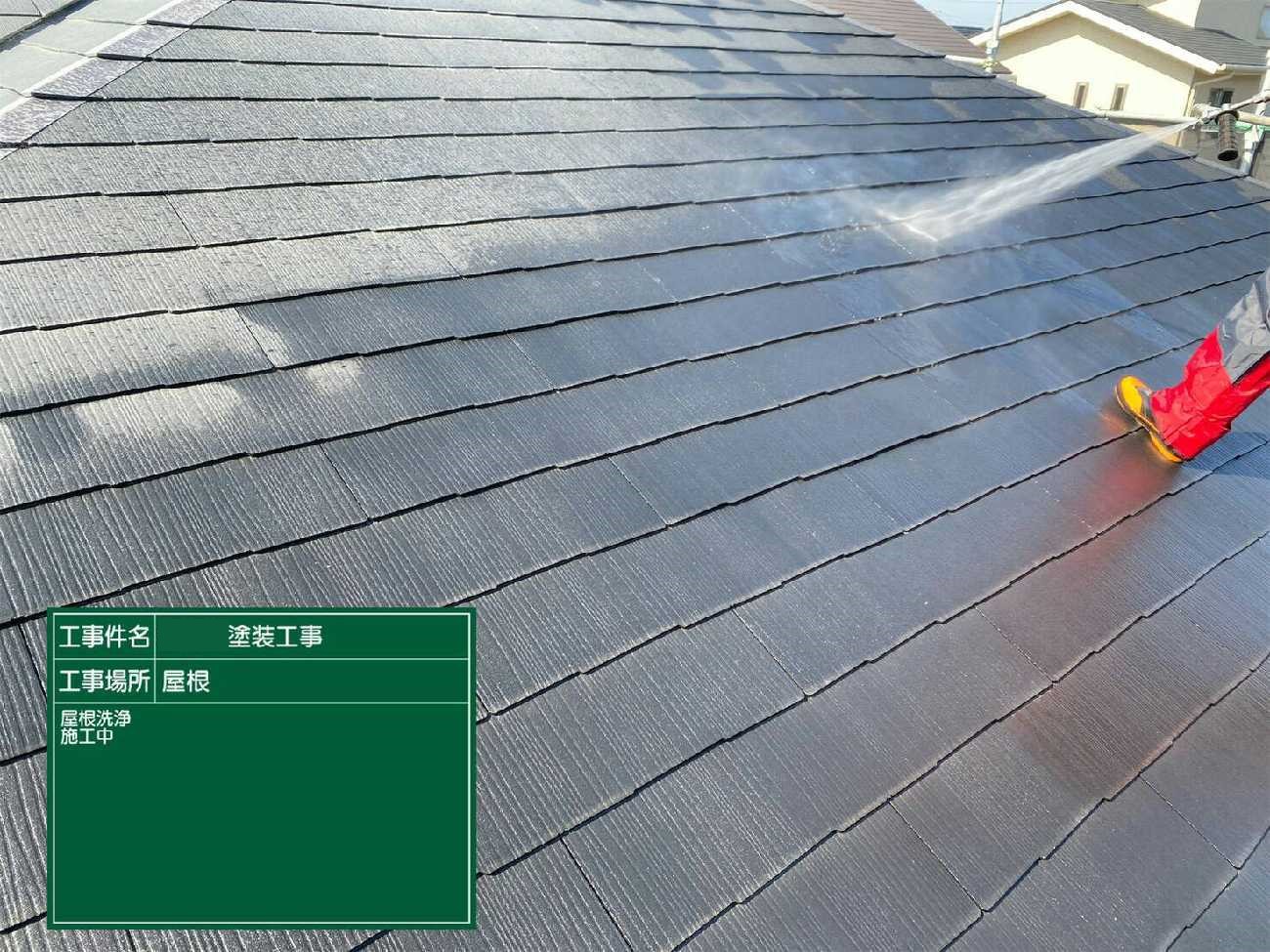 屋根の洗浄作業を行います。洗浄作業では高圧洗浄機を使用している為付着した汚れを一掃することができます。