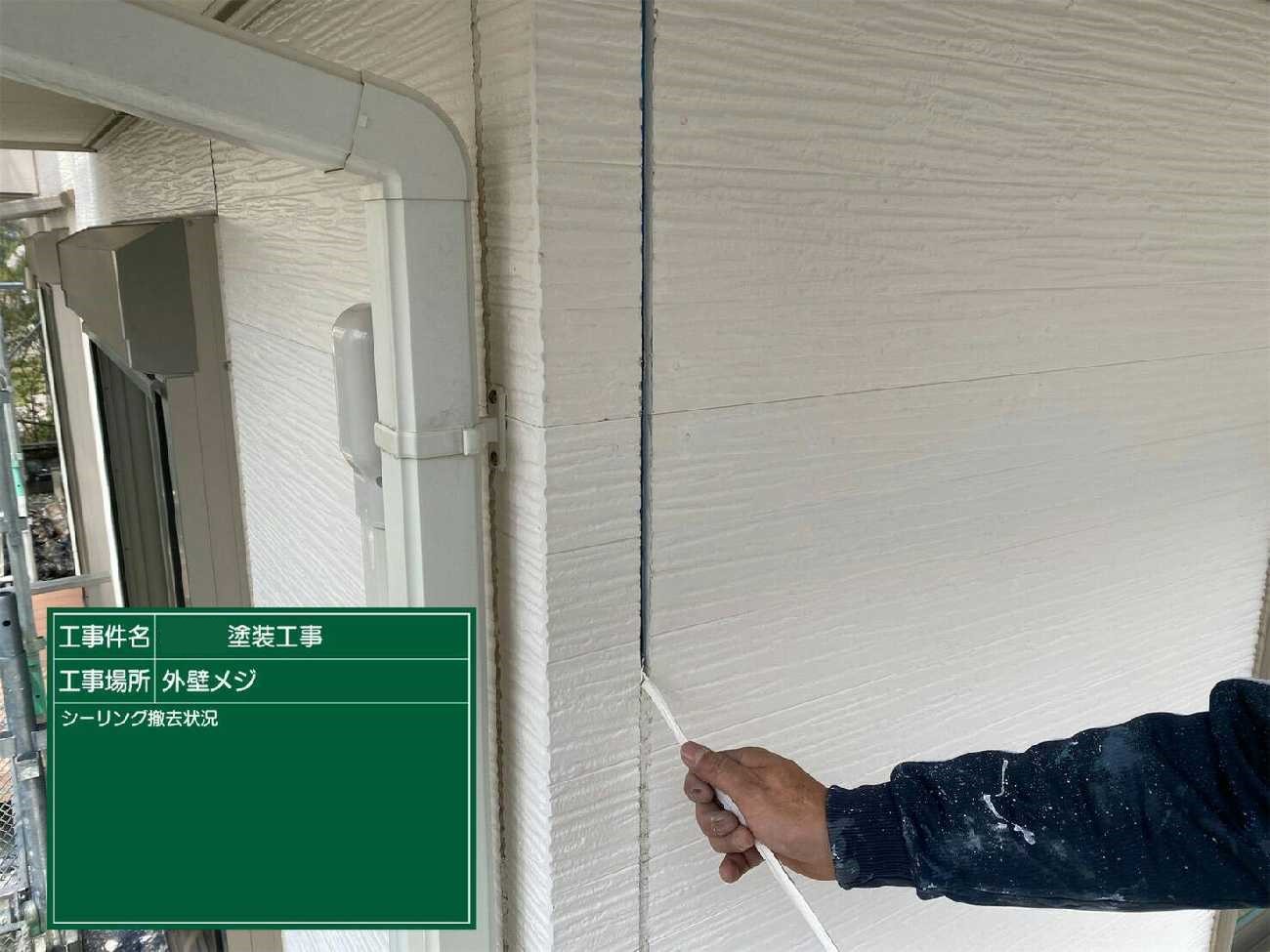 この工程は、古くなったシーリングをカッターなどで切り取り撤去している様子です。