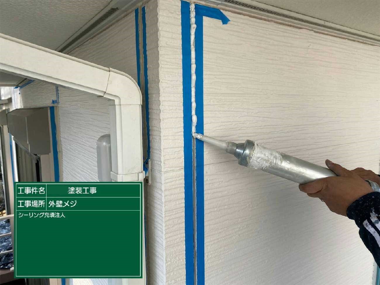目地にシーリングを充填している様子です。目地に沿って丁寧に充填していきます。