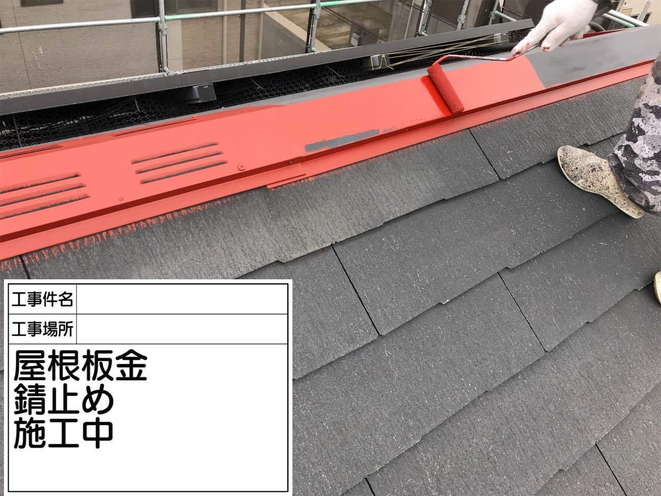 屋根の板金部分に錆止めを塗っている様子です。