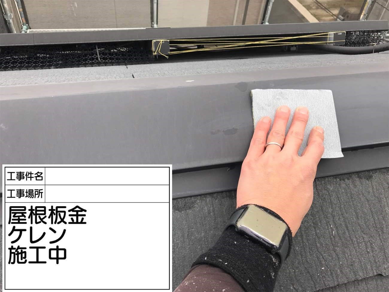 屋根の板金を紙やすりなどを用いて、屋根の金属部分に発生した錆や凹凸を削り、表面をなめらかにしていきます。