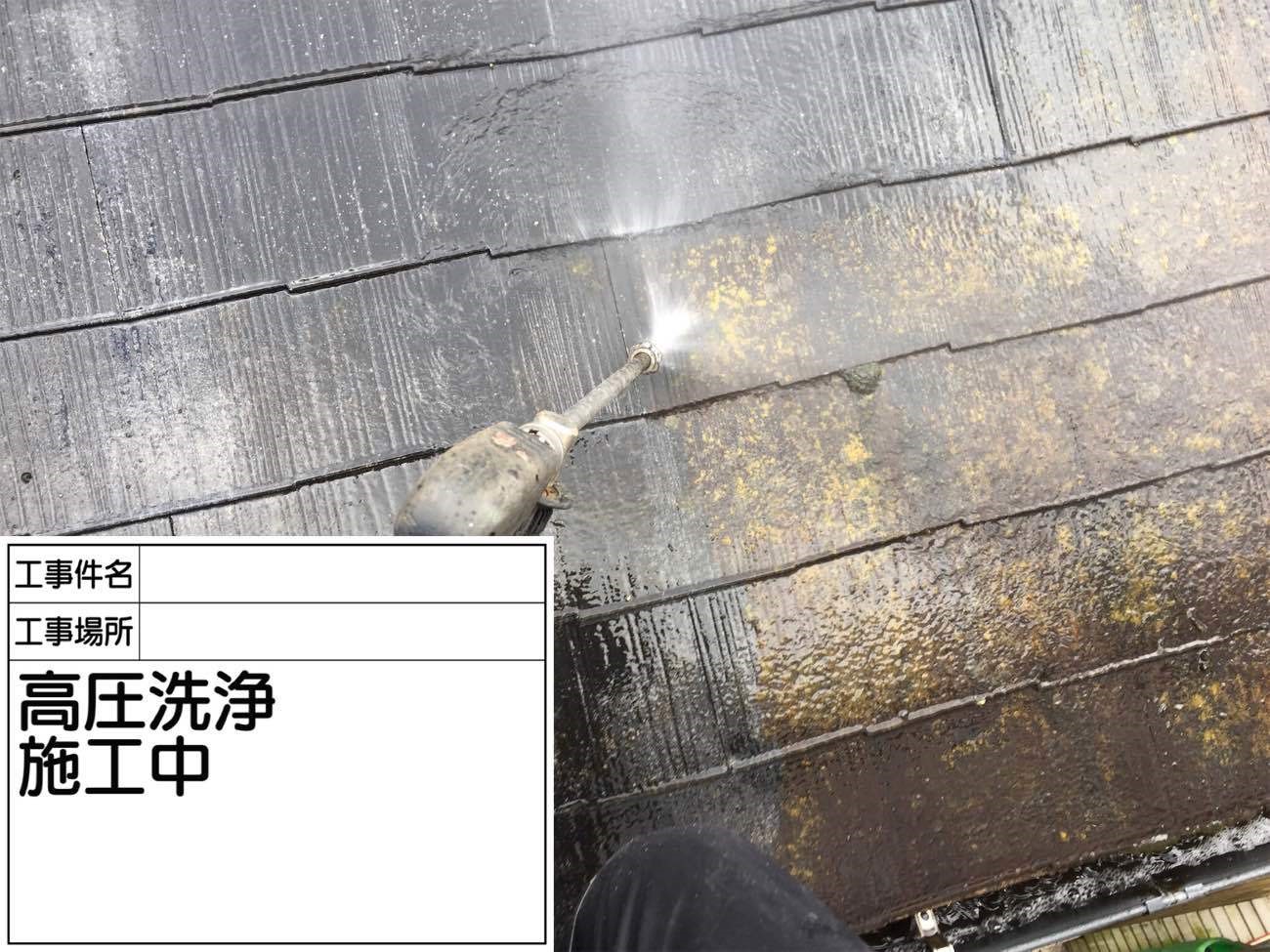 高圧洗浄機を使用して、屋根についたコケや藻、汚れを洗い流していきます。