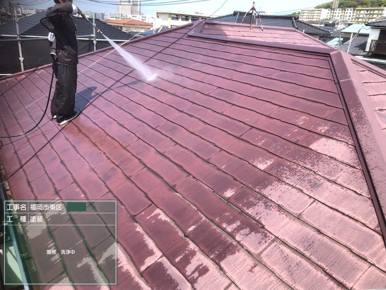 屋根の洗浄作業を行います。洗浄の際にコケなどの汚れを落としていかなければならないため、高圧洗浄機を使用し洗浄作業を行っています。