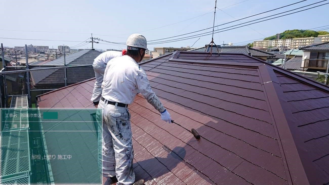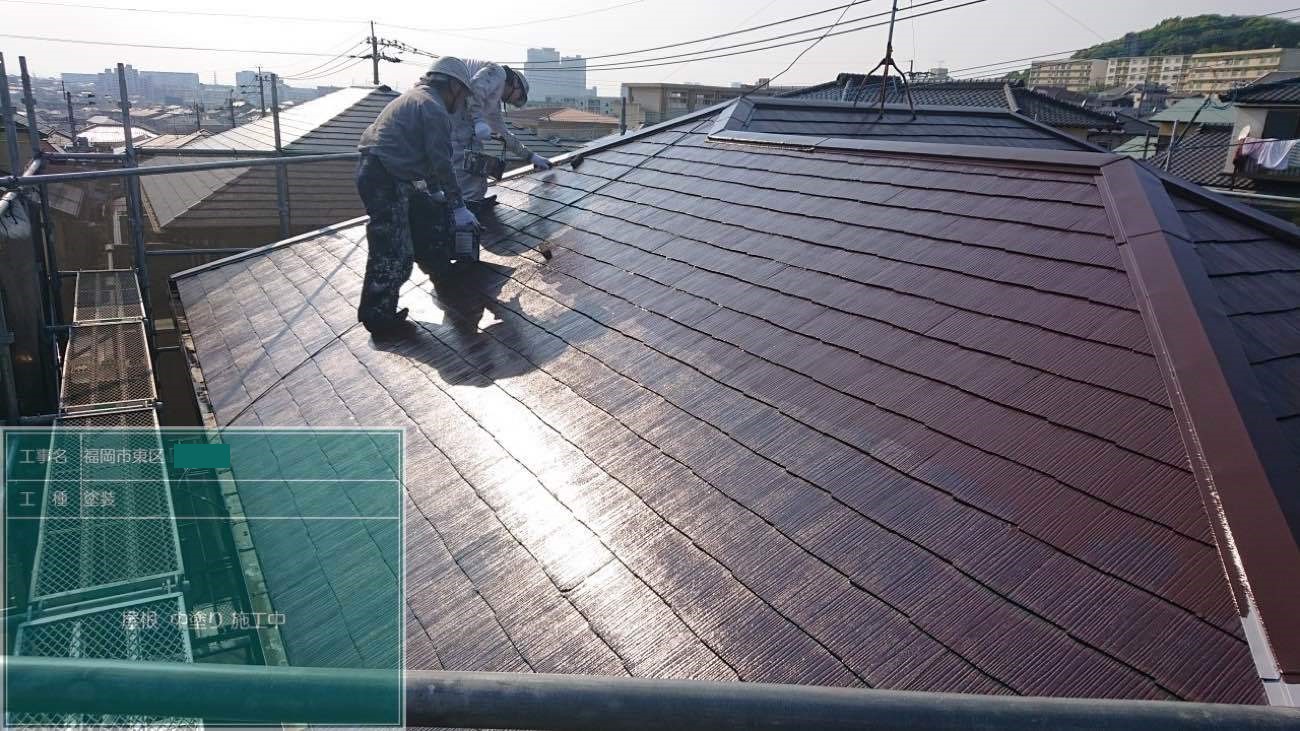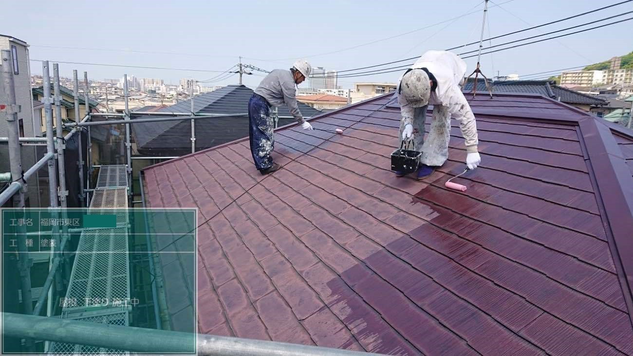 屋根の塗装作業の様子です。これは下塗り作業を行っています。 下塗りで塗料の密着性を高め、中塗り・上塗りの仕上がりが綺麗になるようにします。