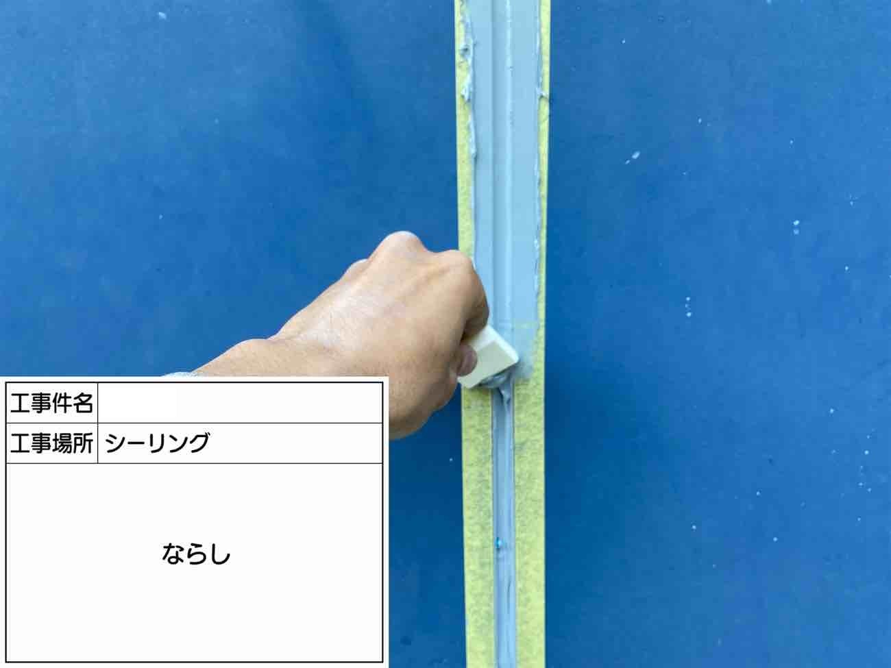 充填したら目地の周りに養生をしているため、目地いっぱいに均一に入るように押さえの作業を行っています。