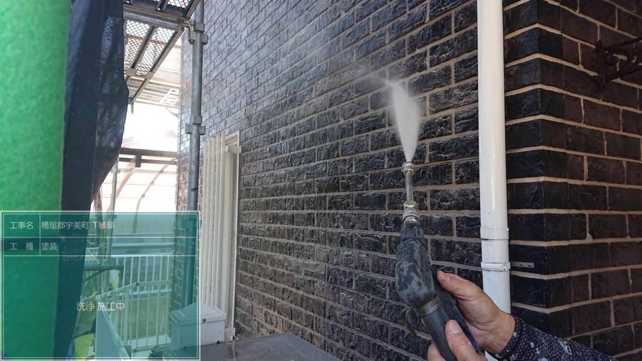 塗装工事の始まりはまず洗浄から。ガソリンで稼働する強力な高圧洗浄機を使っていきます。