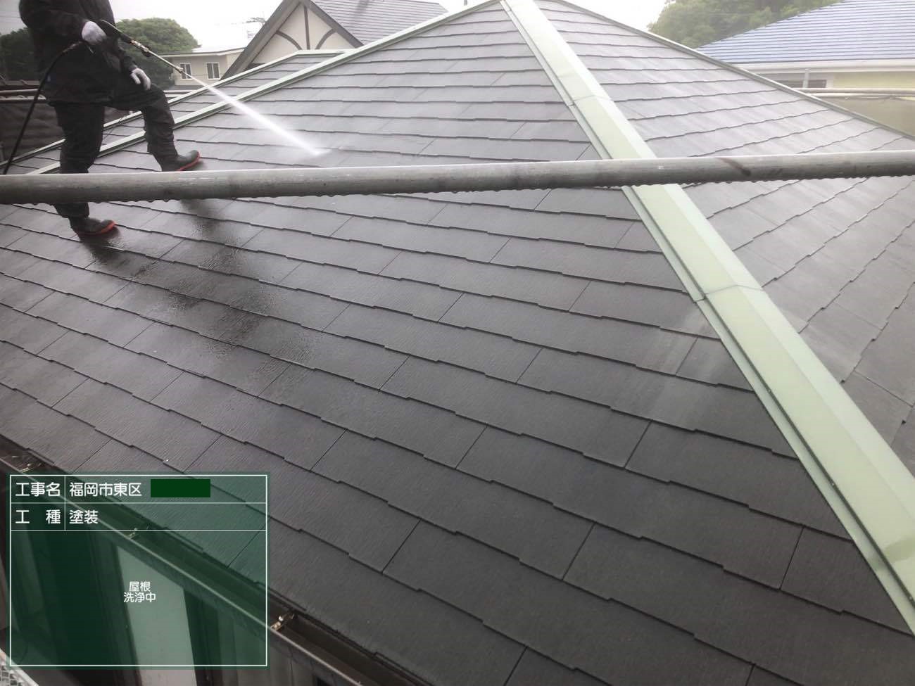 屋根の高圧洗浄作業中です。洗浄作業は塗装を行う際に汚れなどで塗料が剥がれたりしないようにするため