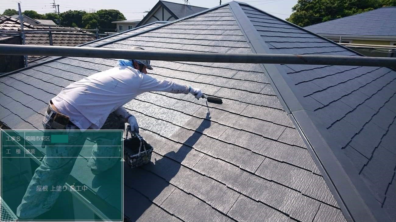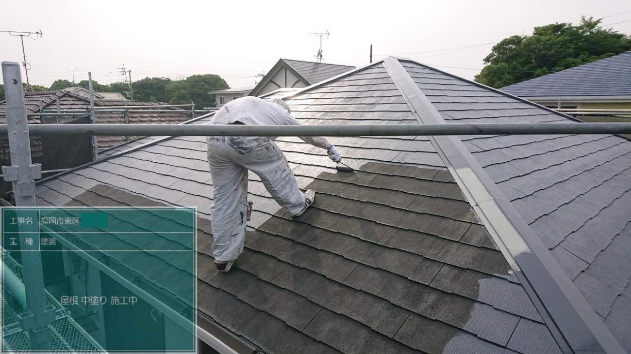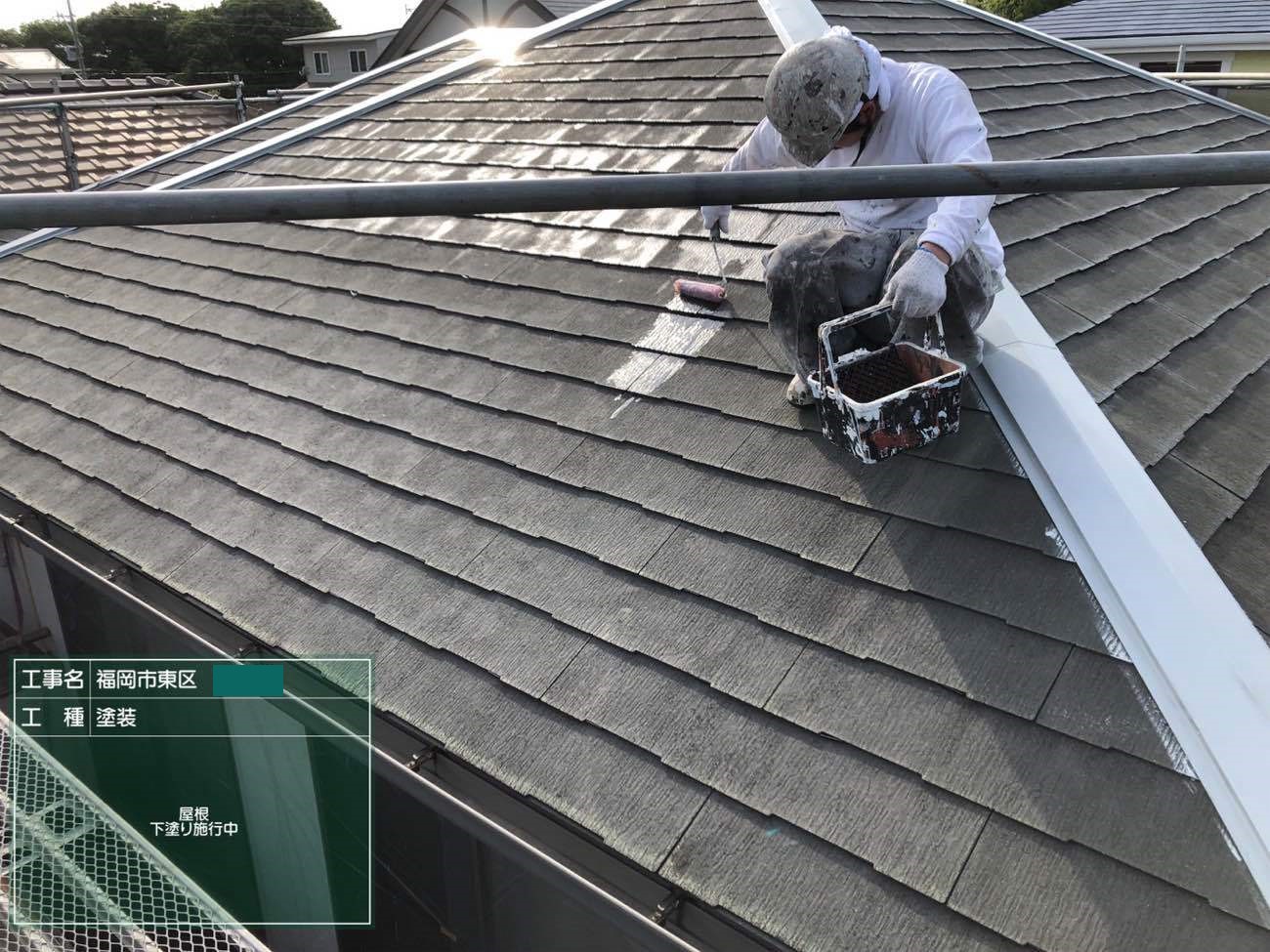 屋根の塗装も下塗りからしていきます。屋根は高い所にあるため紫外線・雨風からの劣化が主に見受けられます。