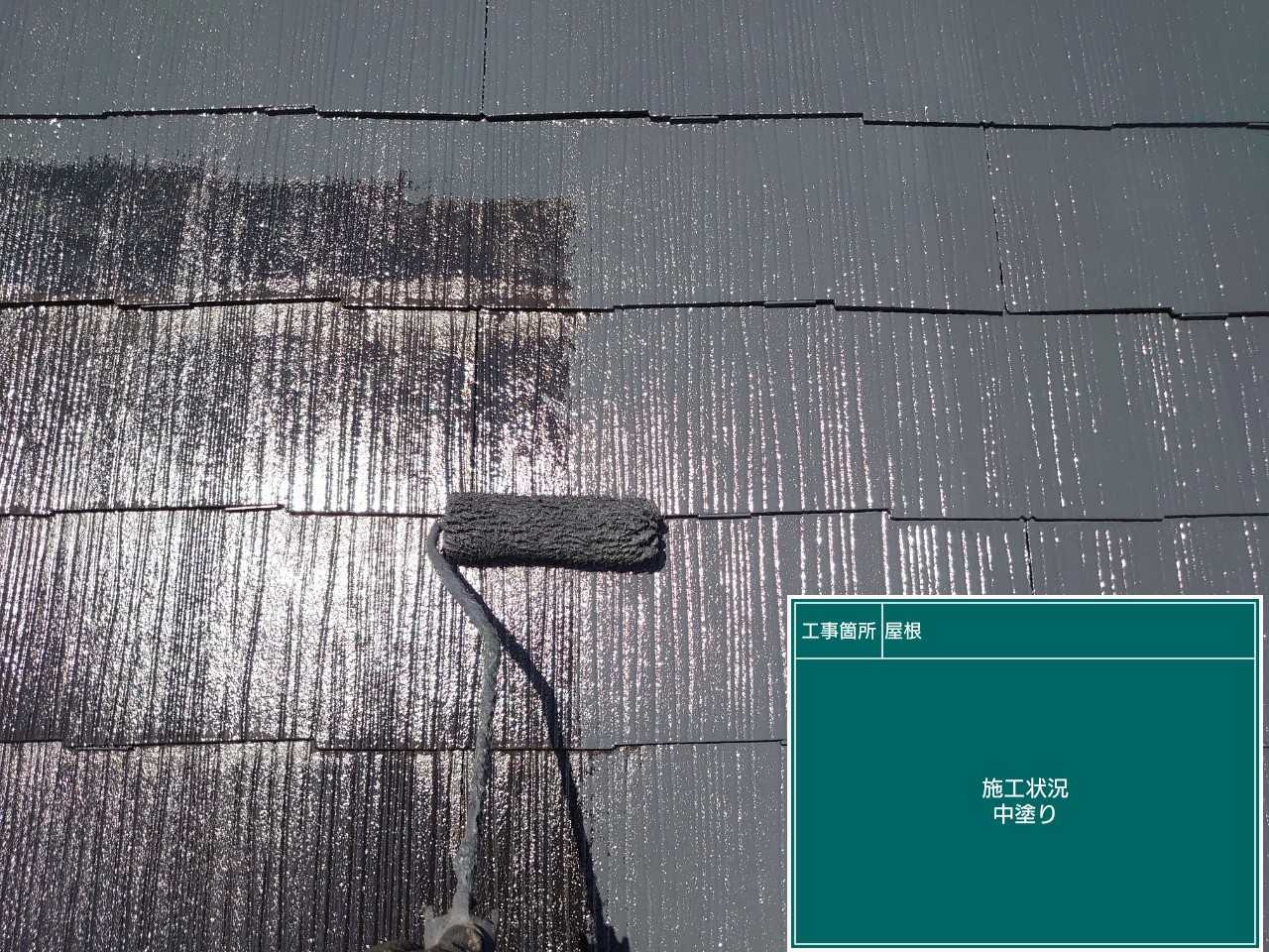 中塗りです。屋根も3回塗りを行います。下塗り・中塗り・上塗りの順で作業を行うのです。