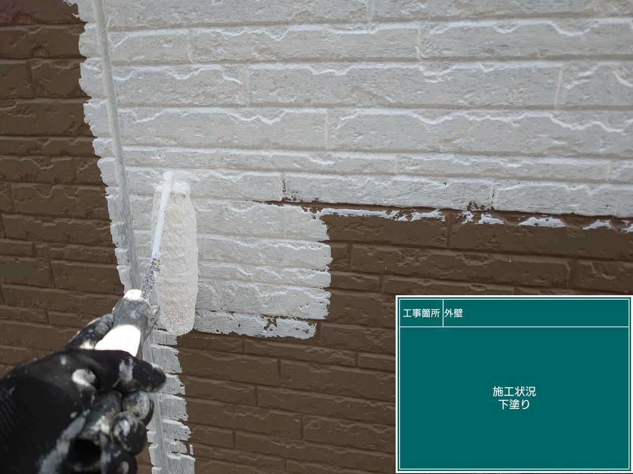 外壁の下塗り作業の様子です。下塗りでは、外壁の下地と中塗り・上塗りの塗料の密着性を高めていきます。